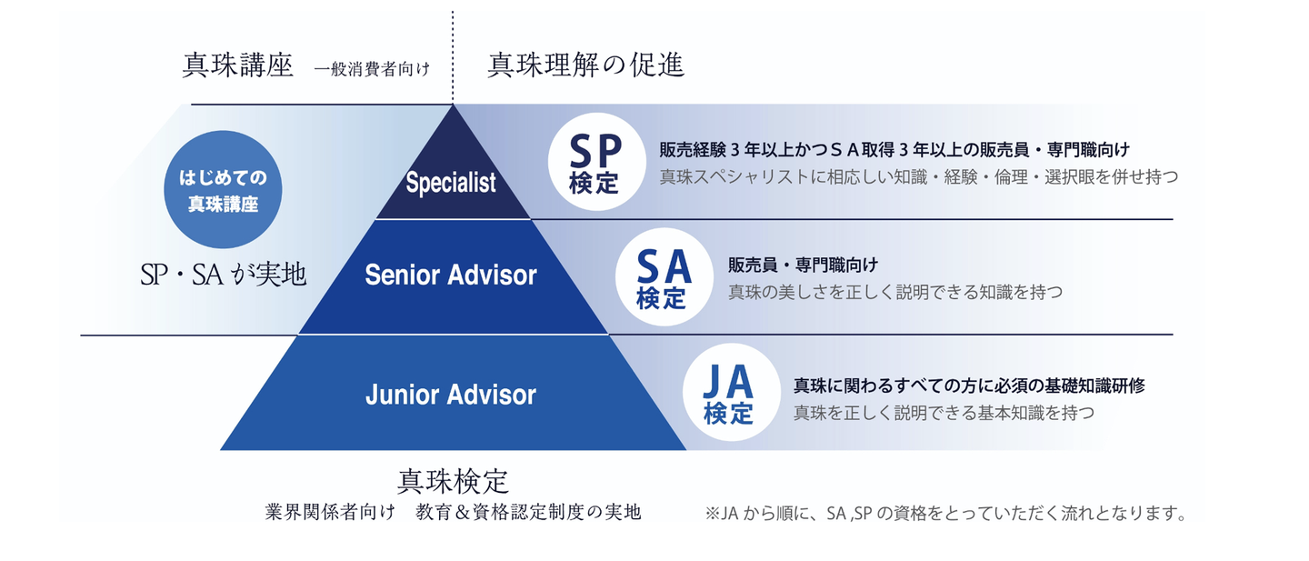 真珠アドバイザー資格取得についてのページです。業界関係者向けの教育&資格認定制度の真珠検定には、JA検定(ジュニアアドバイザー)、 SA検定(シニアアドバイザー)、SP検定(スペシャリスト)の3つの資格取得コースがあります。真に真珠のプロとしてお客様に信頼されるアドバイザーとして行動いただくための検定試験です。真珠に関わるすべての方に必須の研修内容となっております。