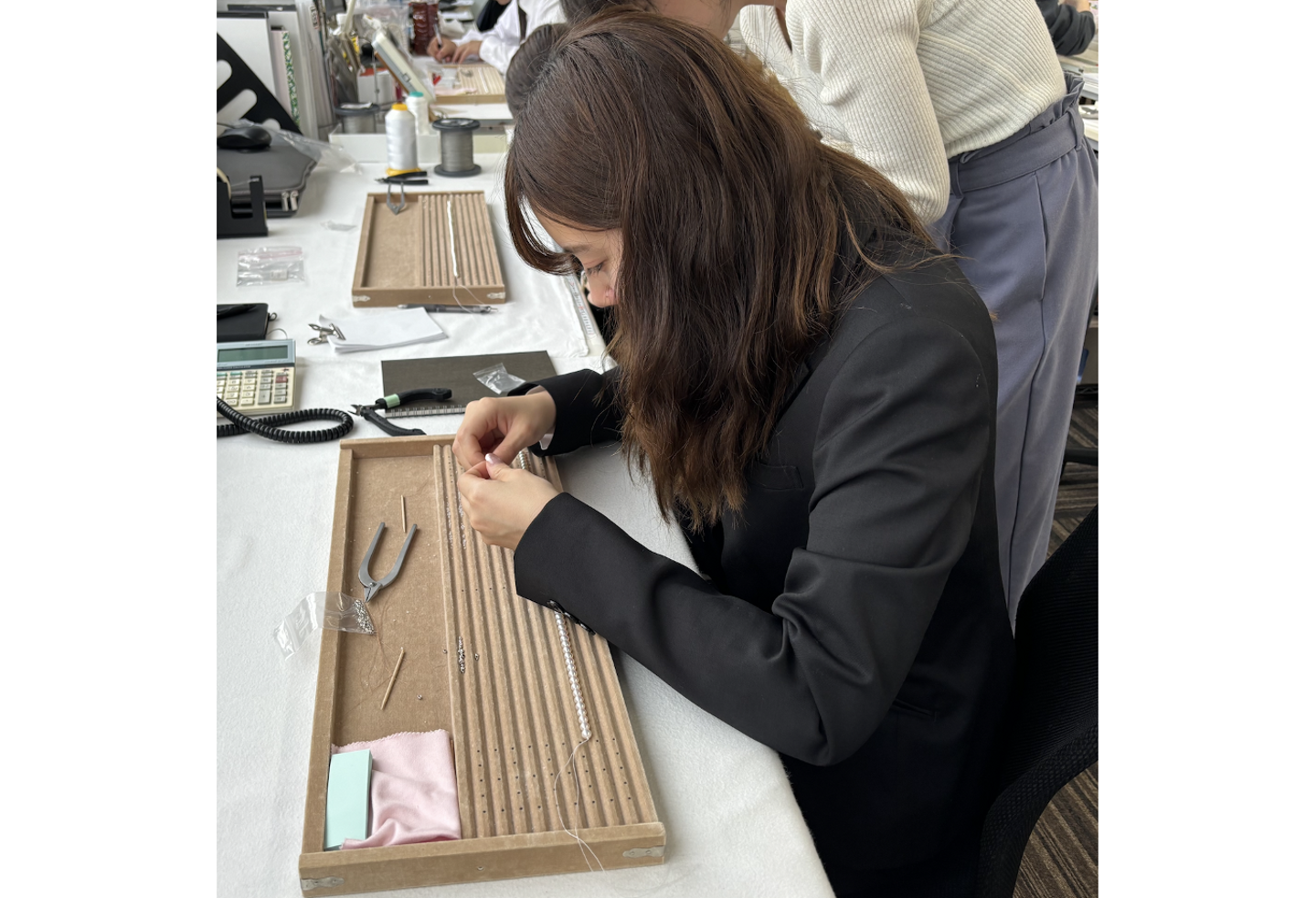 そのほか、実際の商品の理解を深めていただくために、真珠のネックレス加工やピアスの加工など、商品制作も体験!