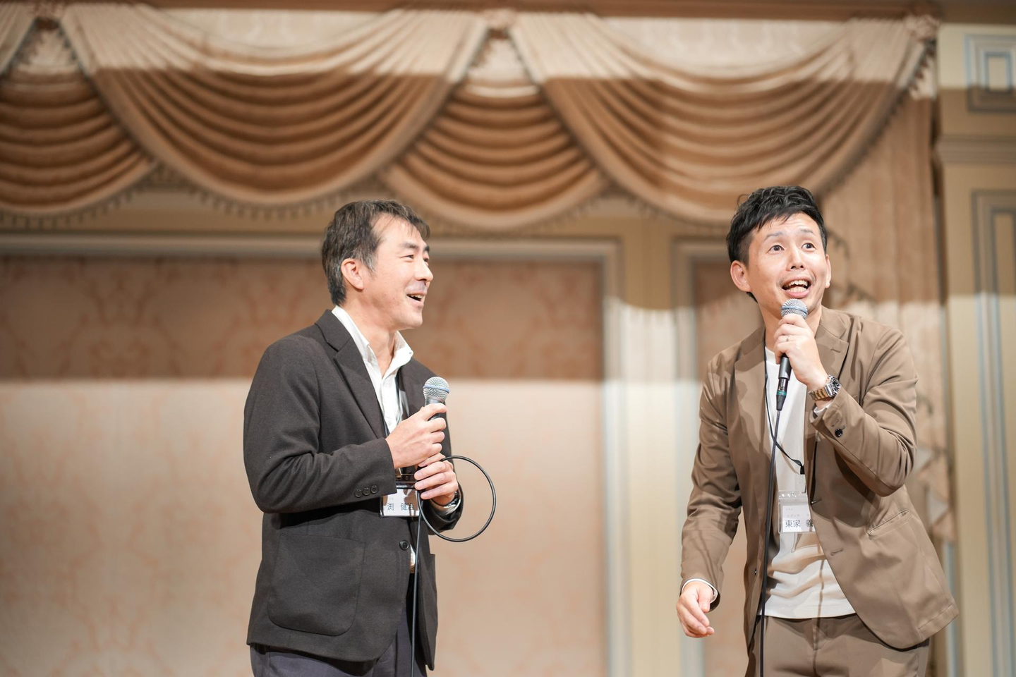 ・社員漫談(管理本部の渕さんとコスメ事業部の東家さん、コンビ名ソーラーパネル)