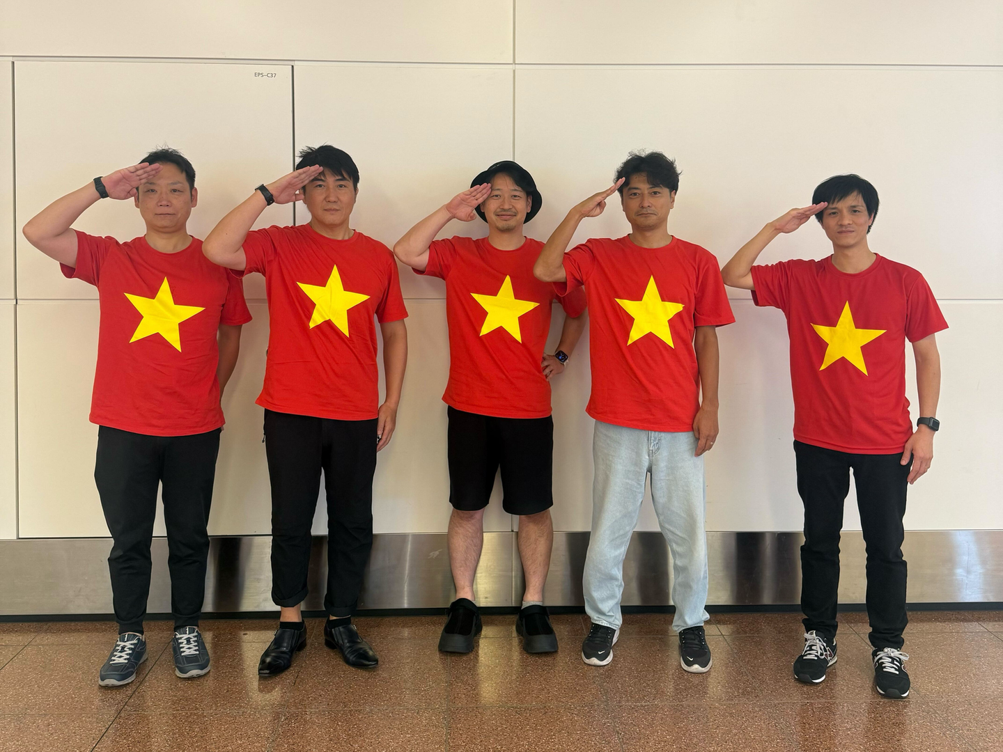 そして当日はベトナム独立記念80周年でもあり、花火やパレードで街が祝福モードに。現地の方は国旗のTシャツを着てお祝いしていたそうで、アピリッツ経営陣も郷に入っては郷に従えという事で着用しました。スポーツ観戦の時もそうですがユニフォームを着ると一体感が出て高まりますよね。遊び心を忘れないアピリッツでした。現場からは以上です!