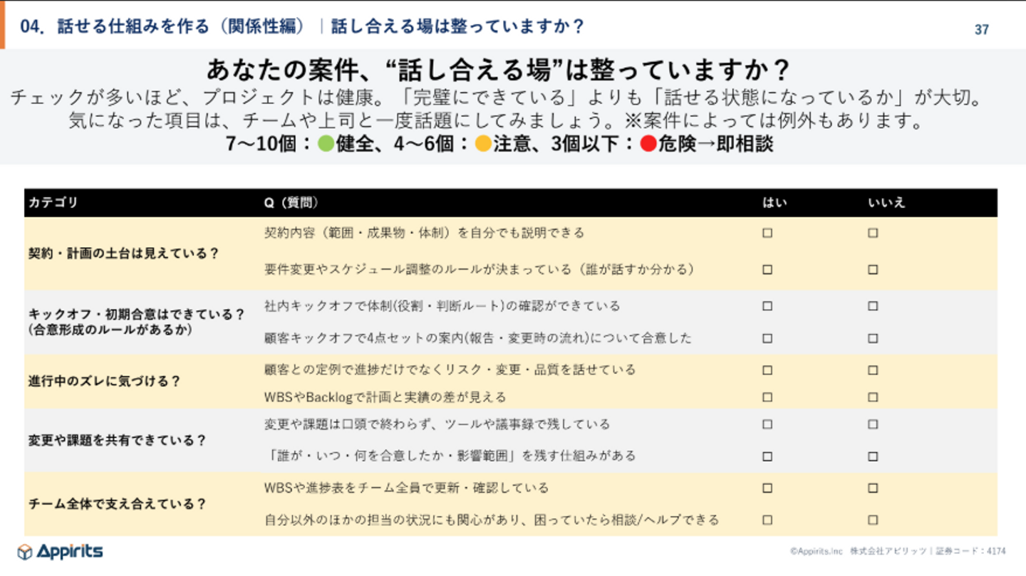 そして健康4点セット(計画・体制・進捗・課題)をそろえてズレに気づける状態をつくることをお伝えしました。
