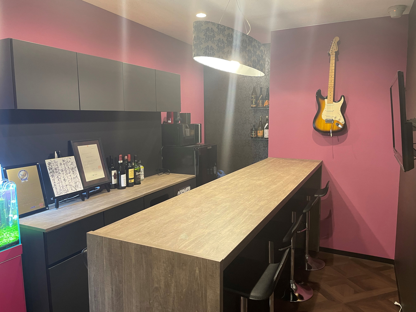 元オフィスのBar は、黒を基調としたシックなカウンターにダウンライトが