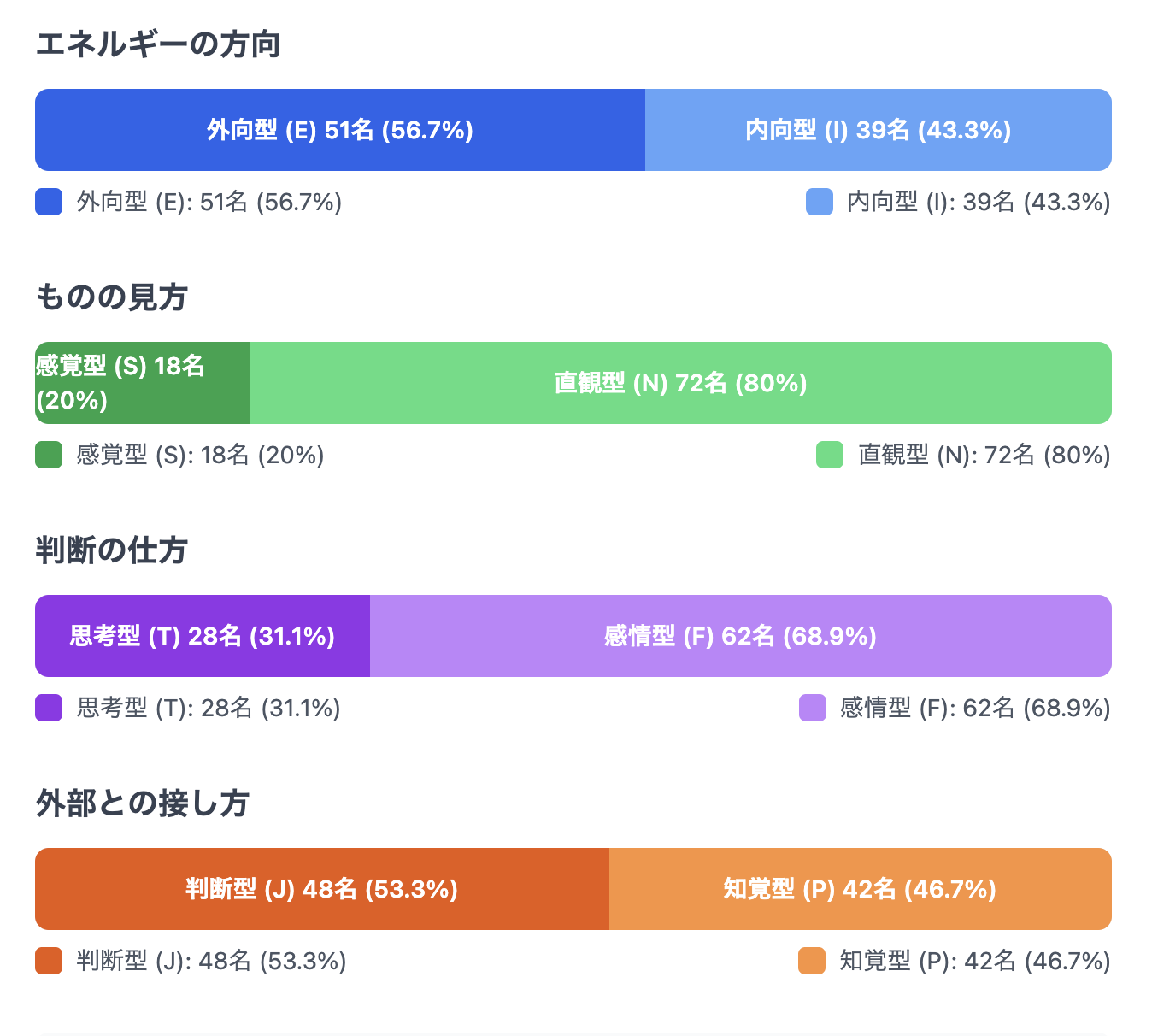NFタイプ(ENFJ, ENFP, INFJ, INFP)の合計は51名と、全体の56.7%を占めていました。