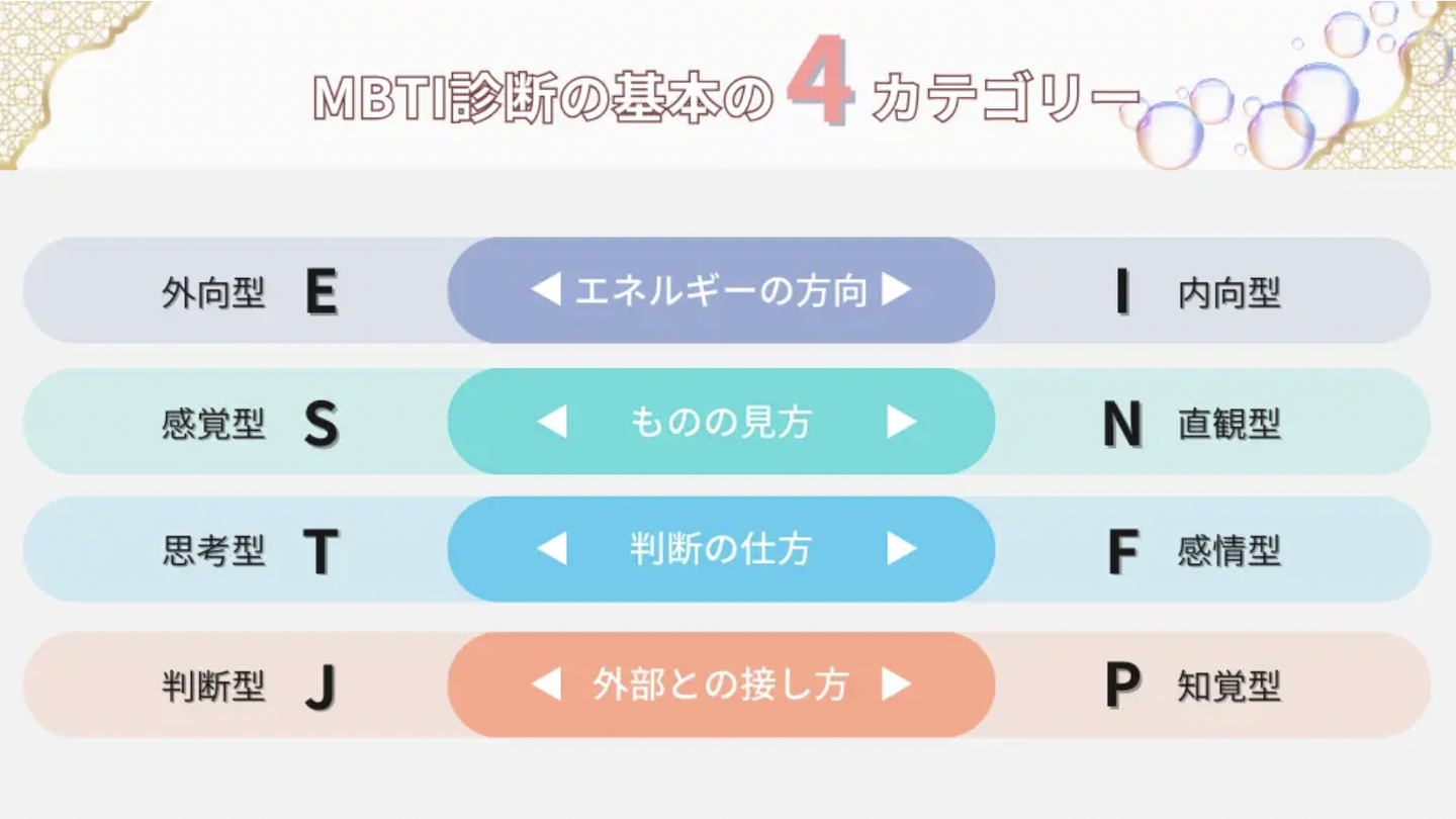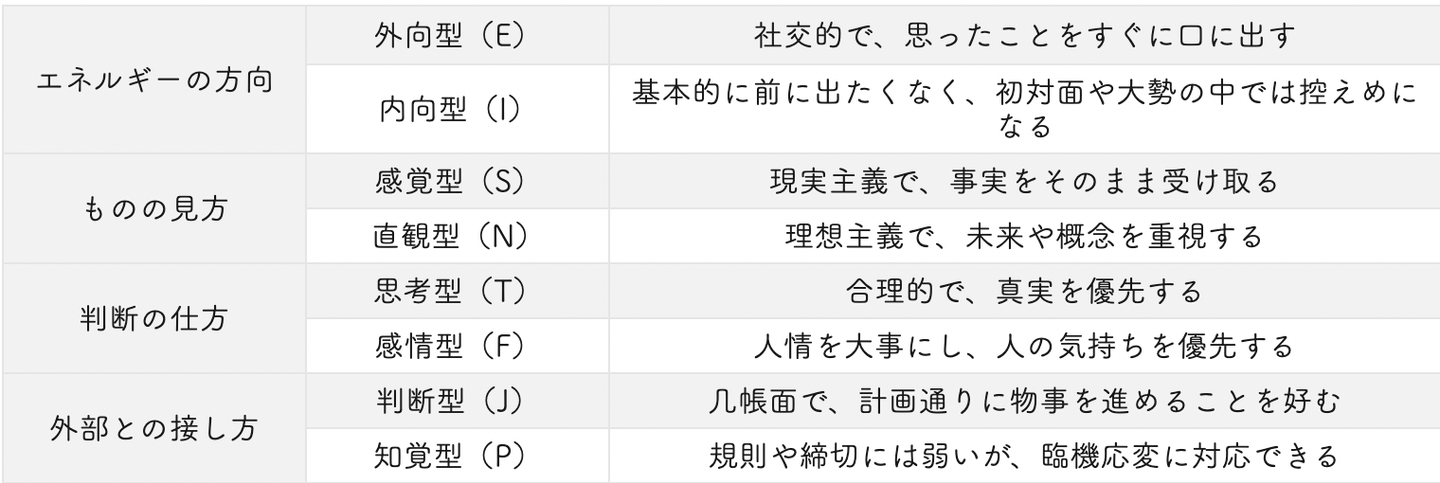MBTIには、性格を構成する4つの指標があります✏️