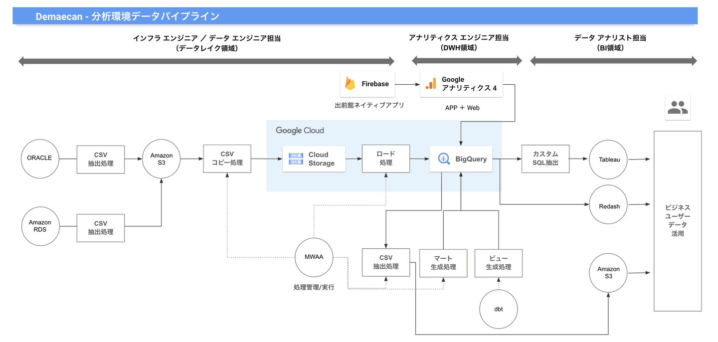 出前館では、注文の処理やドライバーへの指示を行うバックエンドのシステムを他社のクラウド サービスを利用して構築しています。そのため、データ分析の基盤となるデータ ウェアハウスについても、同じクラウド サービスのプロダクトを利用していました。一方で、Web サイトおよびモバイルアプリのアクセスログを格納するデータ ウェアハウスについては、従来から BigQuery を利用していました。今回、出前館が実施した移行プロジェクトの目的は、この 2 つに分かれたデータ ウェアハウスを統合し、BigQuery に一本化することでした。2 か所に分断されているデータを統合することで、分析パターンの拡充や、パフォーマンスの向上といったメリットを得ることができるからです。