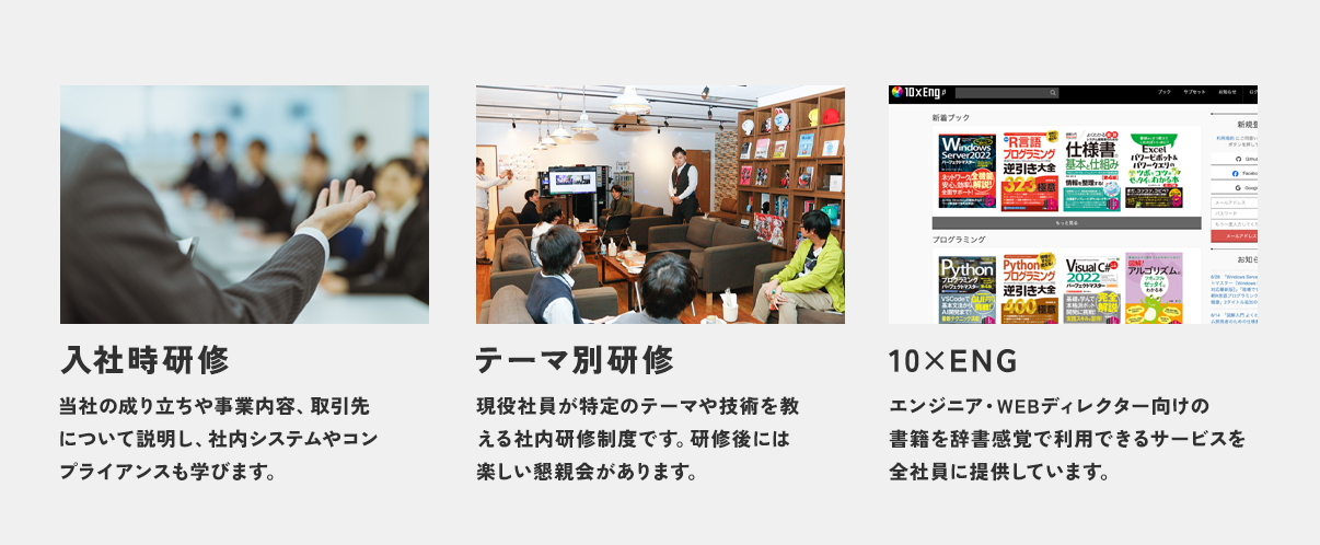 当社では技術交流(共有)、豊富な研修制度を通じて開発スキルのレベルアップを促しています。