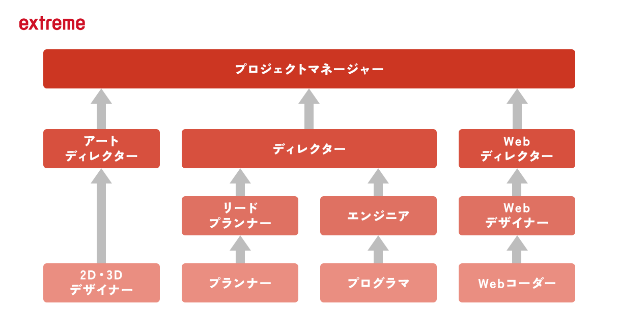当社では、クリエイターとしての創造性を極めるスペシャリスト志望、プロジェクトを円滑に推進するゼネラリスト志望のそれぞれのキャリアパスを歩むことができます。また中にはWEB系・IT系・エンタメ(ゲーム)系といった領域を超えてジョブチェンジされる方もいます。
