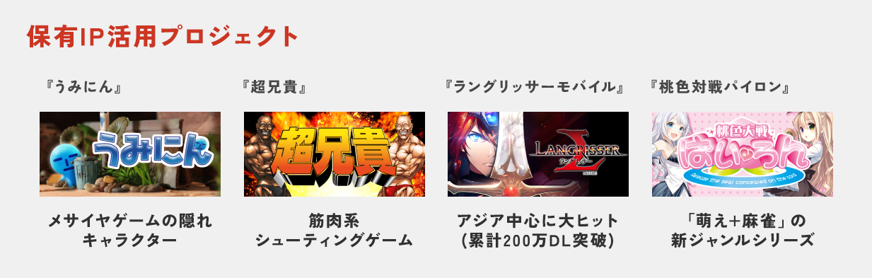 100タイトル超のゲームタイトルやキャラクターに関するIPを保有し、これらIPを利⽤したゲームサービスやライセンスサービスを展開。デジタル⼈材事業において蓄積した技術⼒を活かし、他社IPとの相互連携、事業提携なども視野に入れたスマートフォンアプリ配信、キャラクター事業などマルチユース展開を⾏っています。