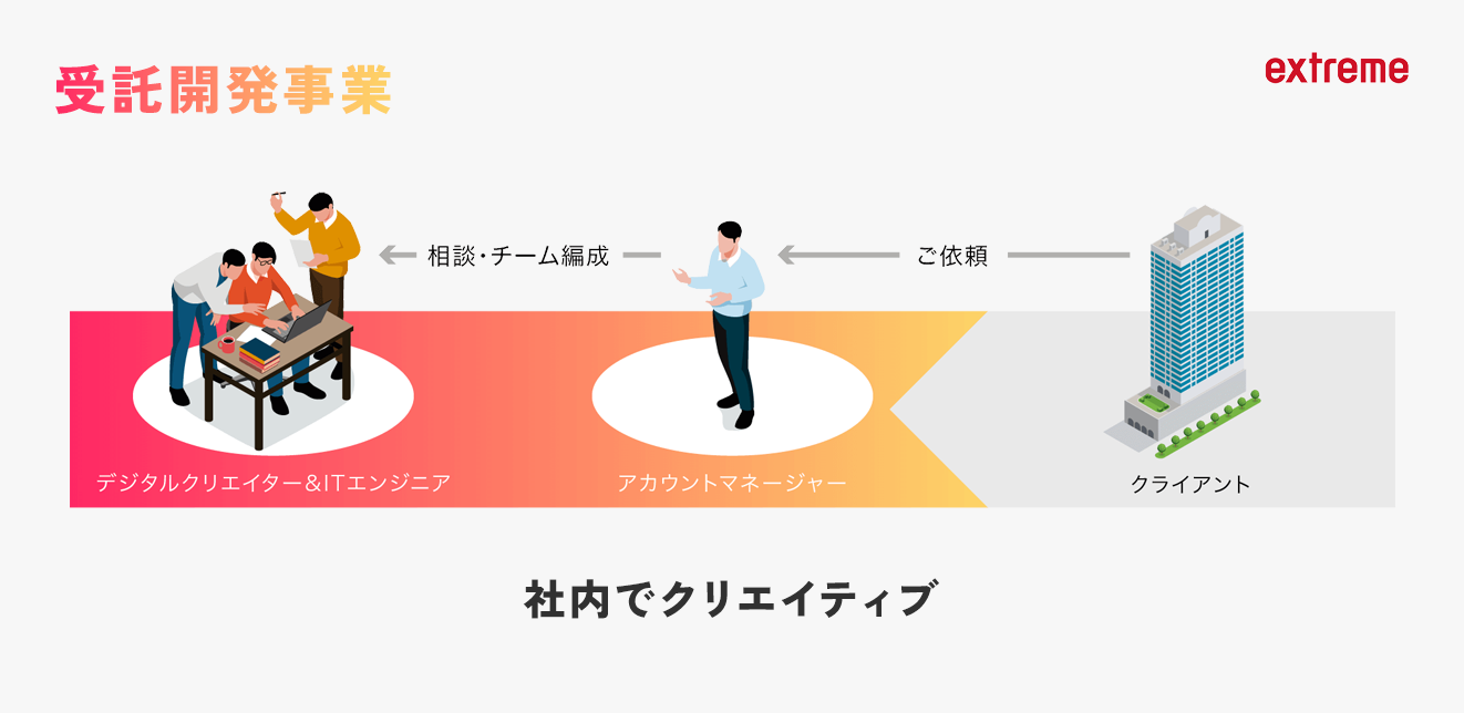 クリエイター&エンジニアのタレント集団を社員として抱えるエクストリームは、企業の求めに応じて 最適なタレントを⼈選し、ユニットとして送り込みます。