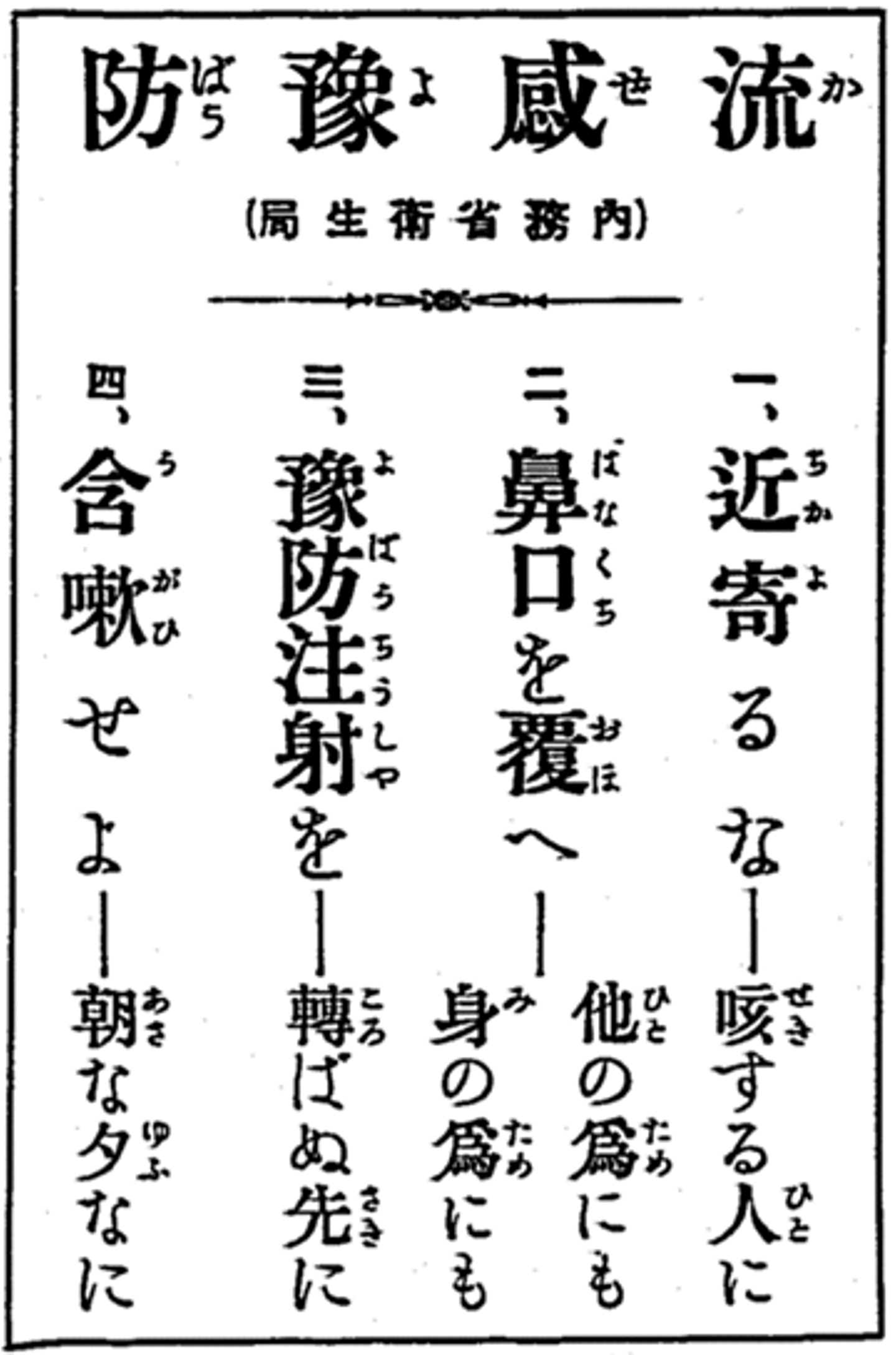 約100年前、スペイン風邪が世界的に流行し日本では45万人が死亡したそうです。まだテレビもラジオもない時代で、当時の政府が街中に貼った注意喚起のポスターは今のそれと驚くほど似ています。