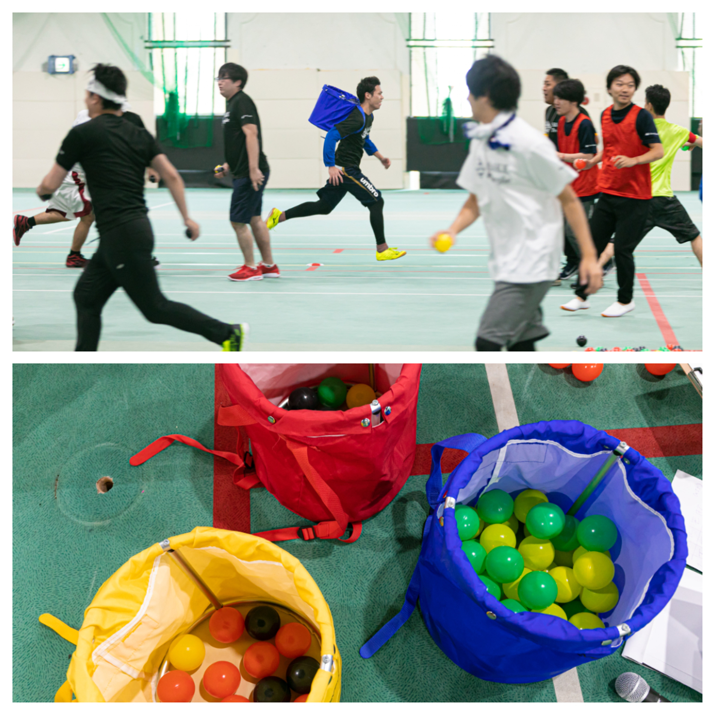 チームで鬼を1人決めて、鬼がカゴを背負って逃げる“背負い玉入れ”。