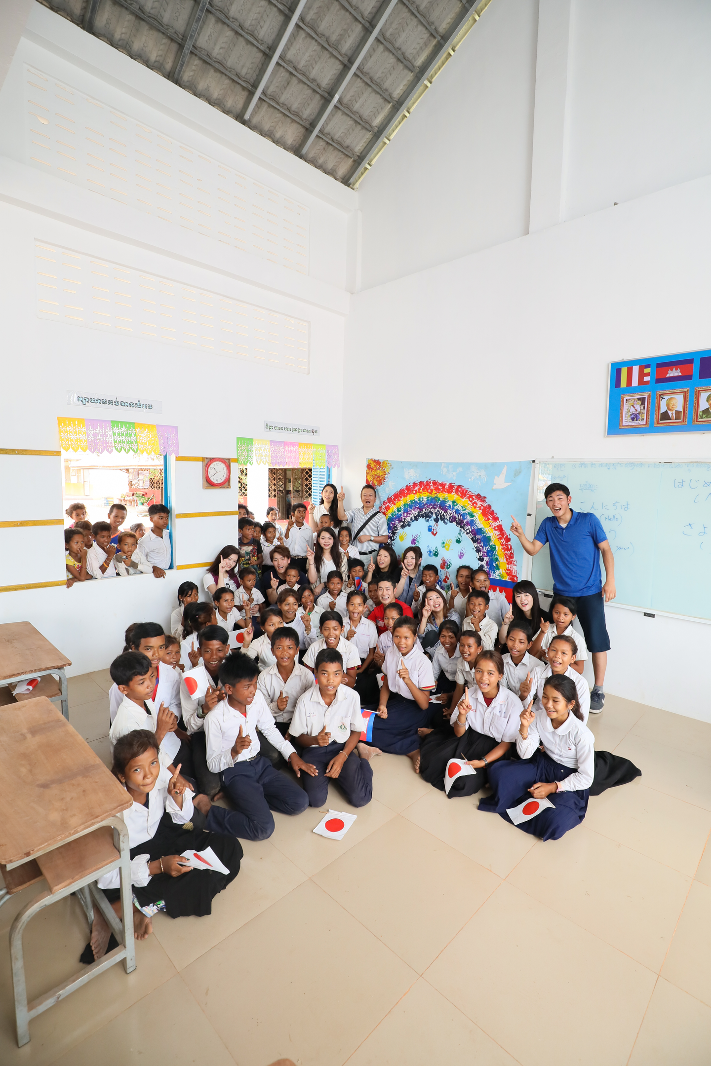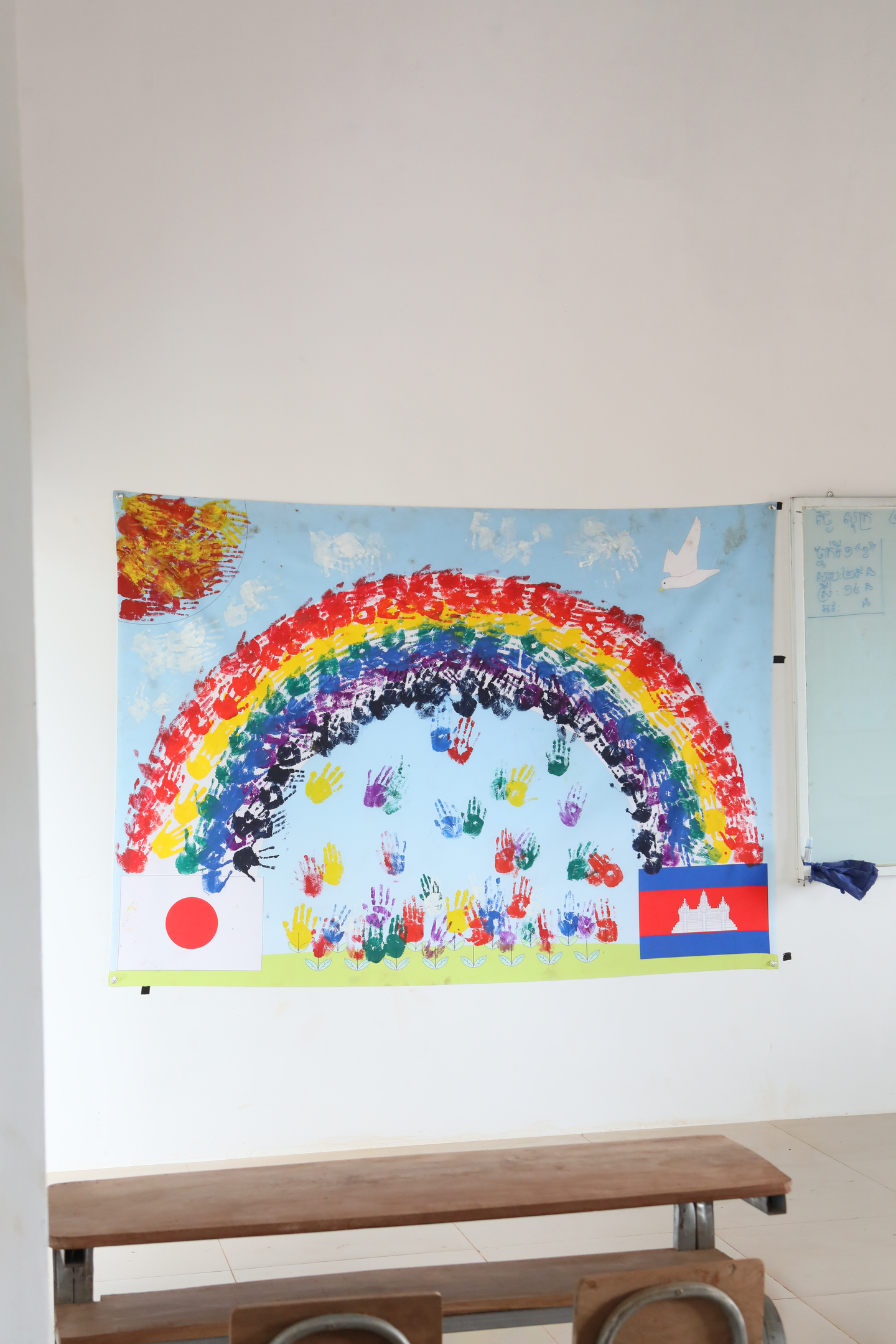 そうですね。2009年から始まった「カンボジア学校建設プロジェクト」では、2016年からD社さまのアルバイトが現地に赴き、カンボジアの子どもたちと交流を行っていて、私はこの活動のお手伝いをさせていただいてます。昨年は学校建設も記念すべき10校目ということで、日本のアルバイトと現地の子どもたちがともに楽しみ、成長できるようなプログラムを目指しました。最終的には、“カンボジアと日本の架け橋”というテーマで、カラフルな虹の手形アートをみんなで描き、教室の壁に飾りました。他にも、子どもたちの10年後の夢を書いたタイムカプセルを校庭に埋めてもらったりしました。“特別な活動にしたい”というお客さまの意思を汲んで、形に残るものを提案したんです。