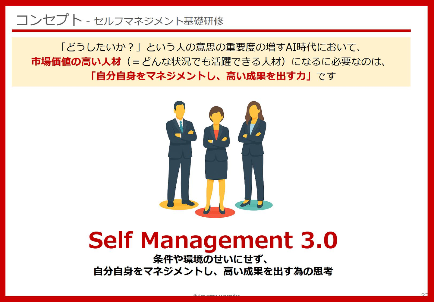 ◆研修事例◆セルフマネジメント研修:弊社では、行動を最大化させる3つの思考を含む若手人材が必要なマインドセットを「セルフマネジメント3.0(=自分自身をマネジメントし、高い成果を出す思考)」という概念に体系化し、研修として提供しています。クライアントのご状況に合わせて1日完結型~3か月毎の研修セッションまで、幅広く対応しております。