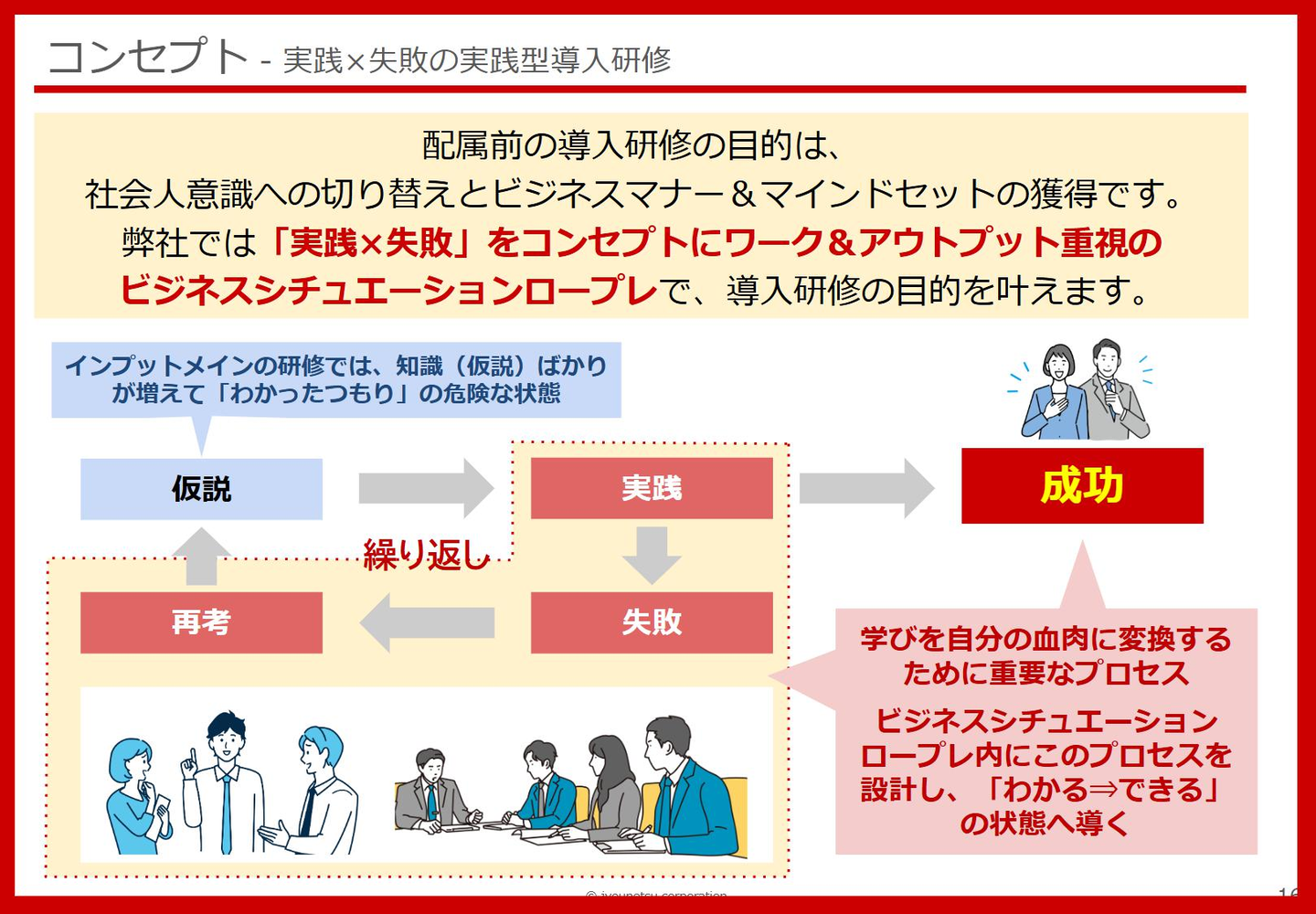 ◆解決策◆実践×失敗の実践型導入研修:「課題、問題を自分事化して捉える(=自己責任思考)」と「自分から情報を取りに行くスタンス(=主体的思考)」を「実践×失敗」から「わかる⇒できる」にするように、上記で解説したようなビジネスシチュエーションロールプレをメインに設計した研修です。配属前なので、自分たちが配属してからどんな失敗に出くわす可能性が高いのかも把握できて一石二鳥です。