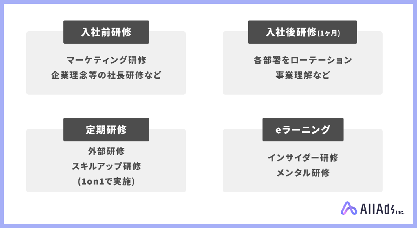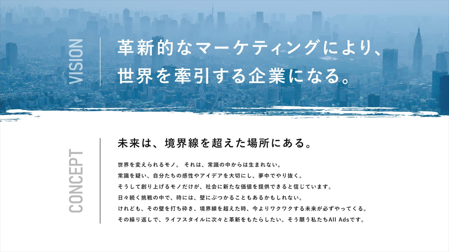 また、次世代マーケティングを担う優秀な人材を輩出すべく、従業員の教育・育成にも力を入れております。新社名「株式会社All Ads」の名のもとに、全ての広告に対して最適解を導ける専門集団として、業界を牽引してまいります。