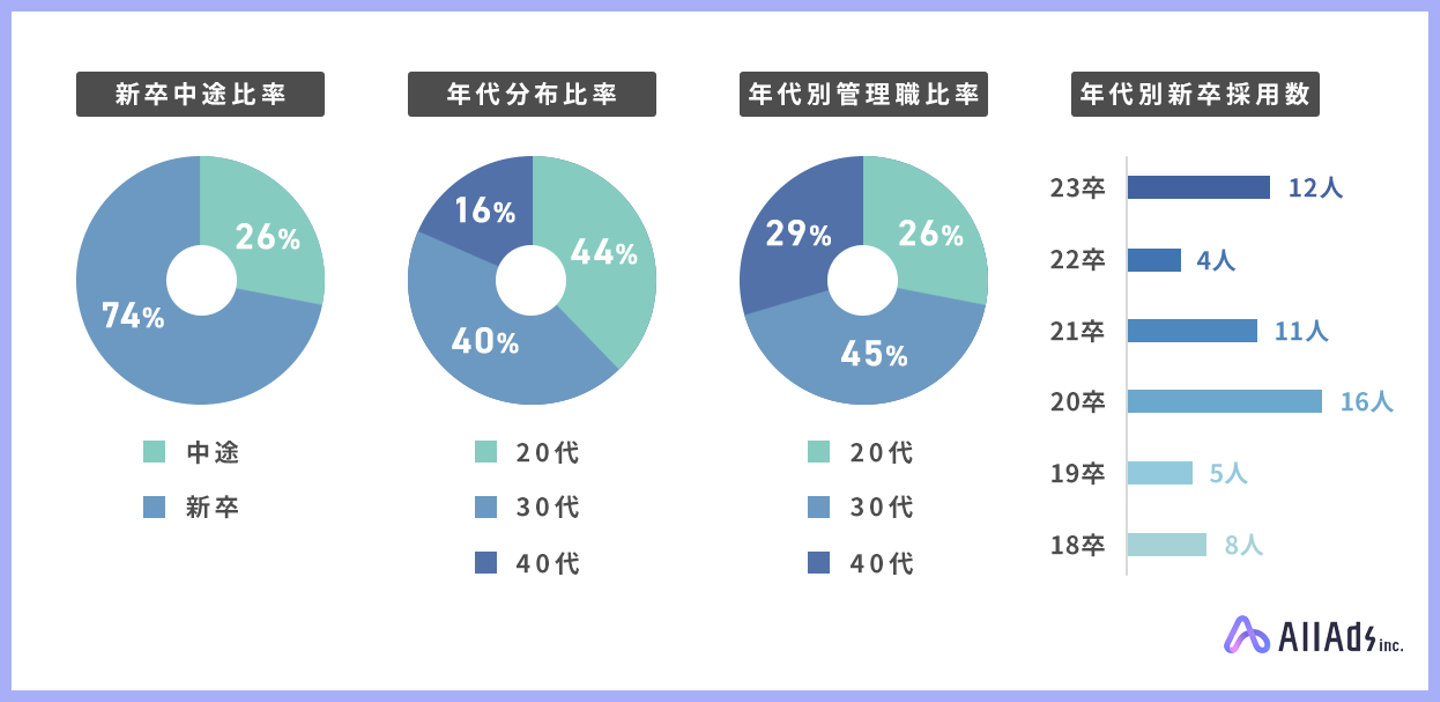 All Adsでは、20〜40代の社員が活躍中。年功序列ではなく、実力主義の評価制度によって20代の管理職も多数在籍し、裁量権と責任感のある仕事を若いうちから経験することができます。