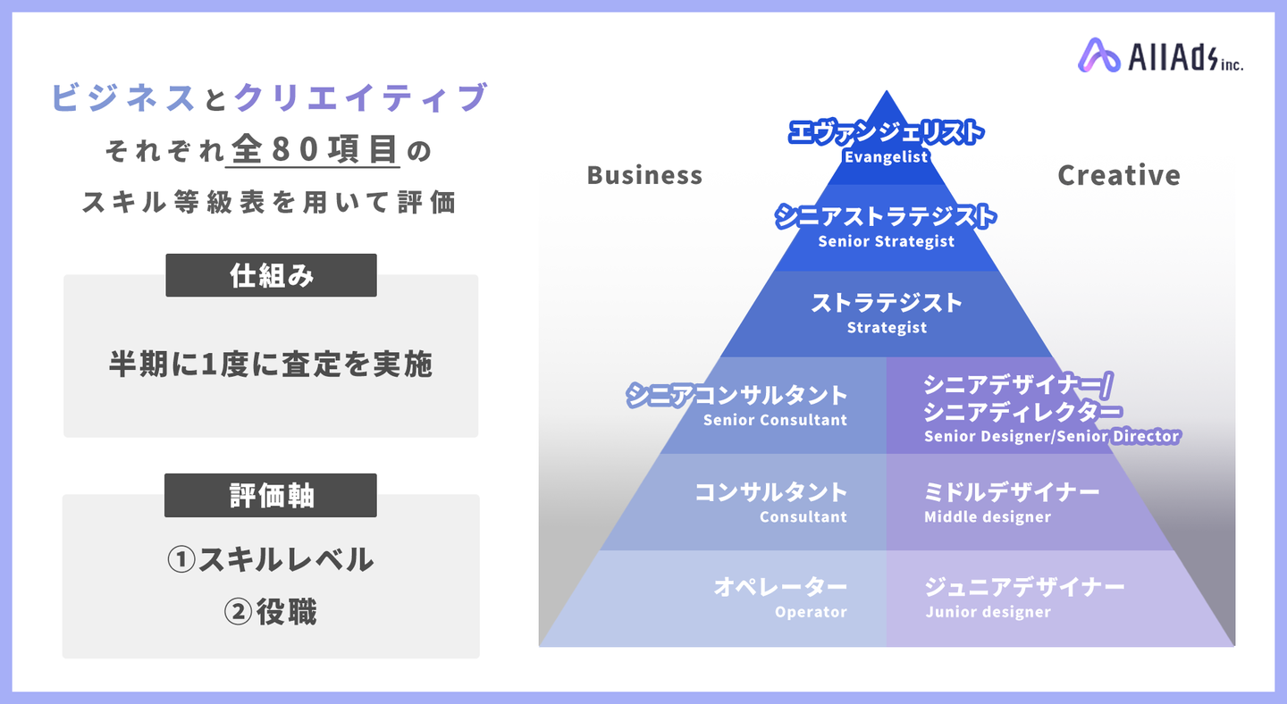 査定は半期に1度、評価は「役職」とそれに見合う「スキル等級」によって判断されます。