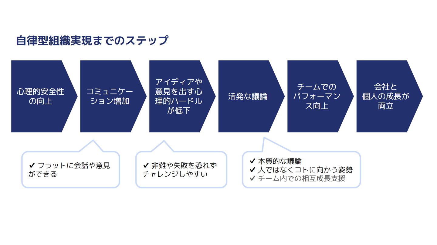 先述の通り、ノースショアはサーファーの自己実現と会社の成長・発展の両立が可能な自律型組織を目指しており、心理的安全性がどのようにして「サーファーの自己実現と会社の成長・発展の両立が可能な自律型組織」に寄与しているのかを図で示すと、以下の形で説明することができます。
