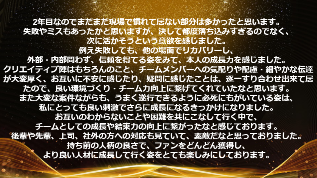 シンプルに対話量が多かったこと、そして直接的な接点を持ち続けたことが、受賞の理由に繋がっているかもしれません。
