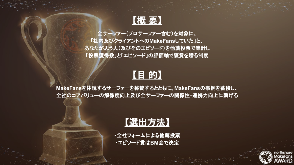 MakeFans Awardとは、1年の締めくくりとして行われる全社アワードの中で「サーファー(社員)」にスポットを当てたアワードです。