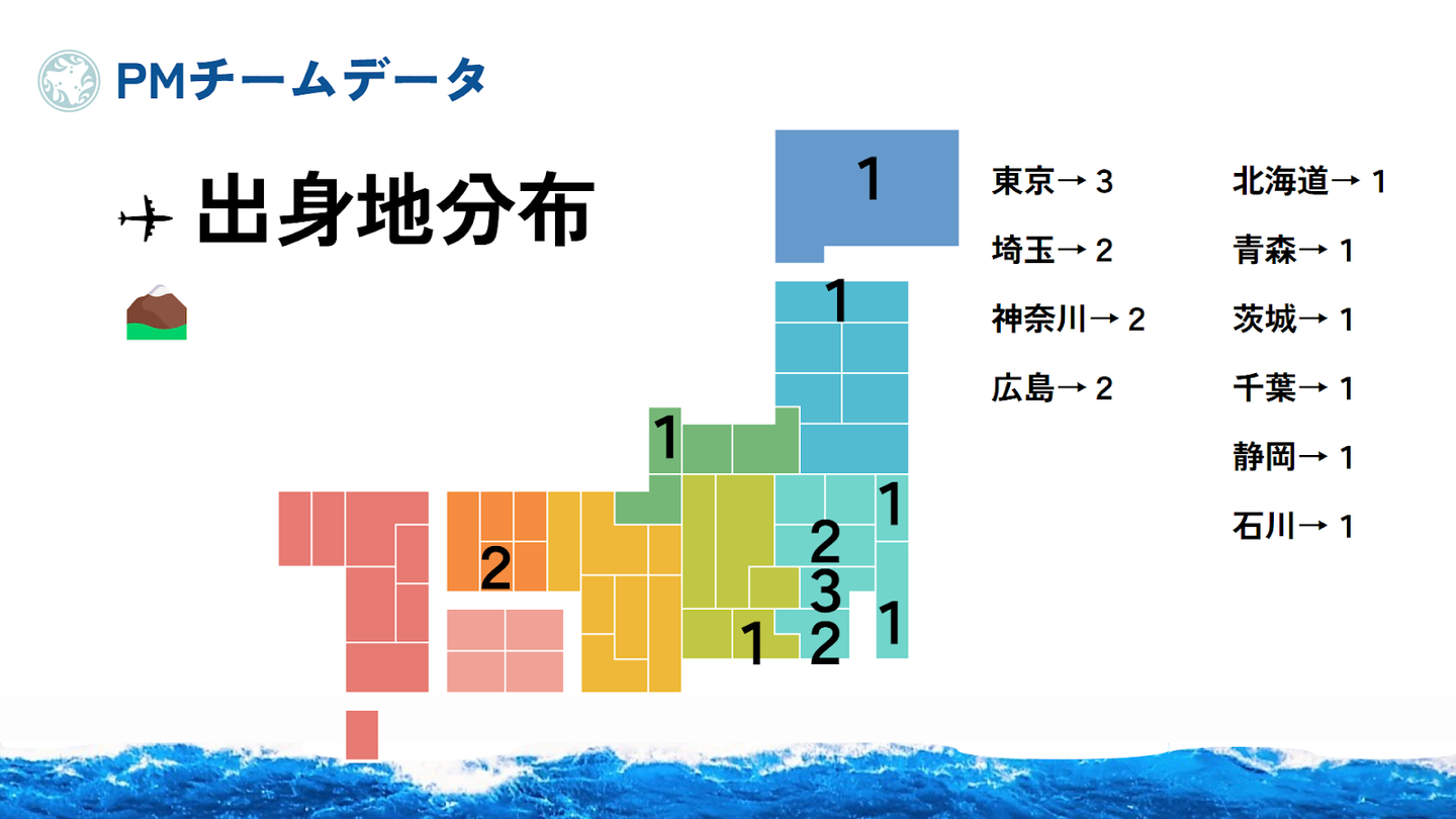 出身地分布や平均通勤時間、おすすめランチなどの様々な情報を基に、PMチームの紹介を行ってもらいました。