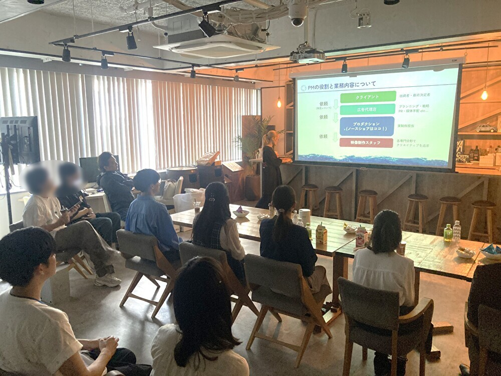 さて、懇親会後半は「プロダクションマネージャー職とは」というテーマで、業務内容や入社後の流れを説明する講義パートから始まりました。