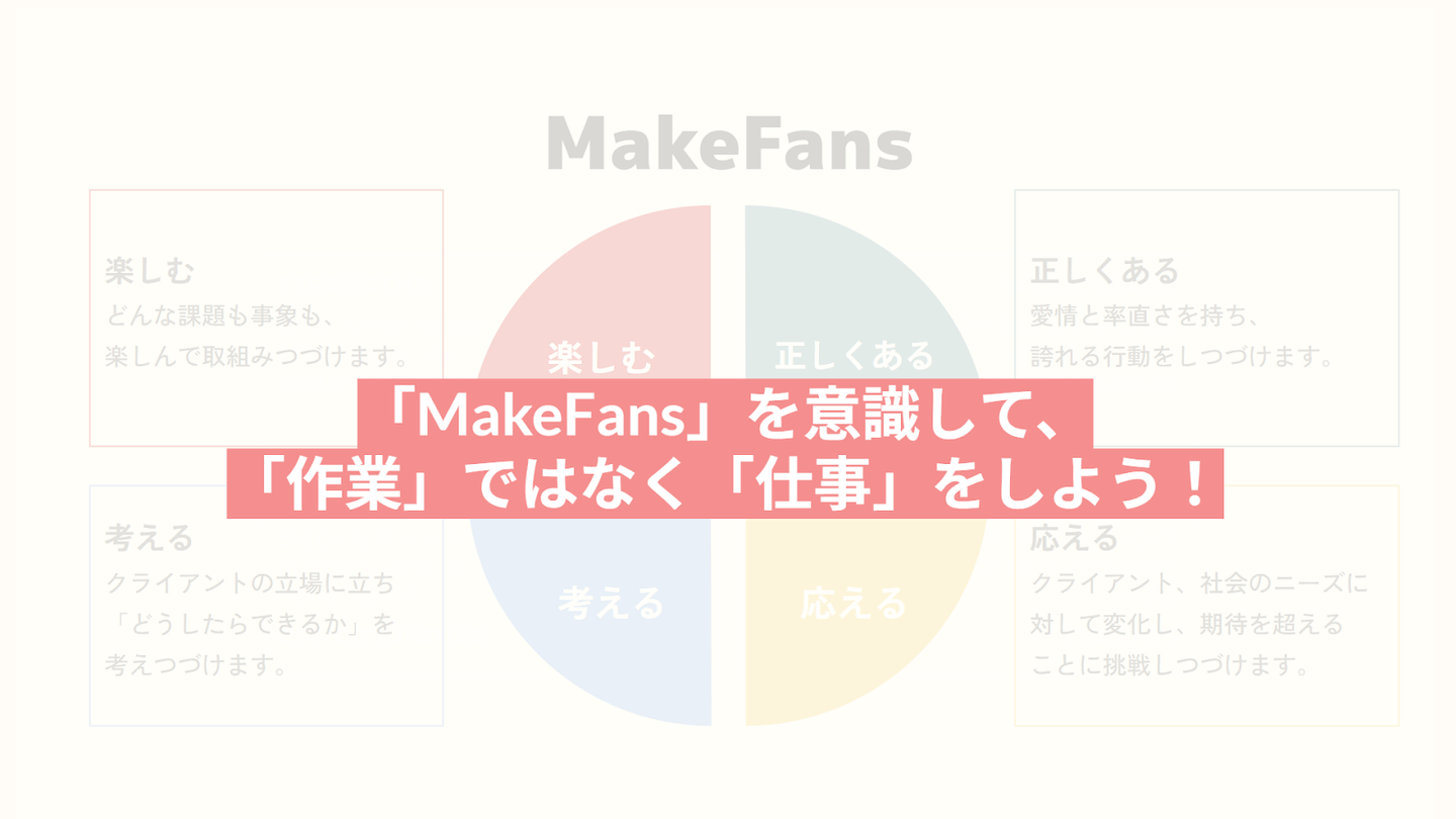自責思考や自己管理、報連相などは「社会人として当たり前」であると軽視されがちですが、当たり前を当たり前にできている人こそが周囲の人々を「MakeFans」しており、また「仕事」をしている人でもあるのかもしれません。