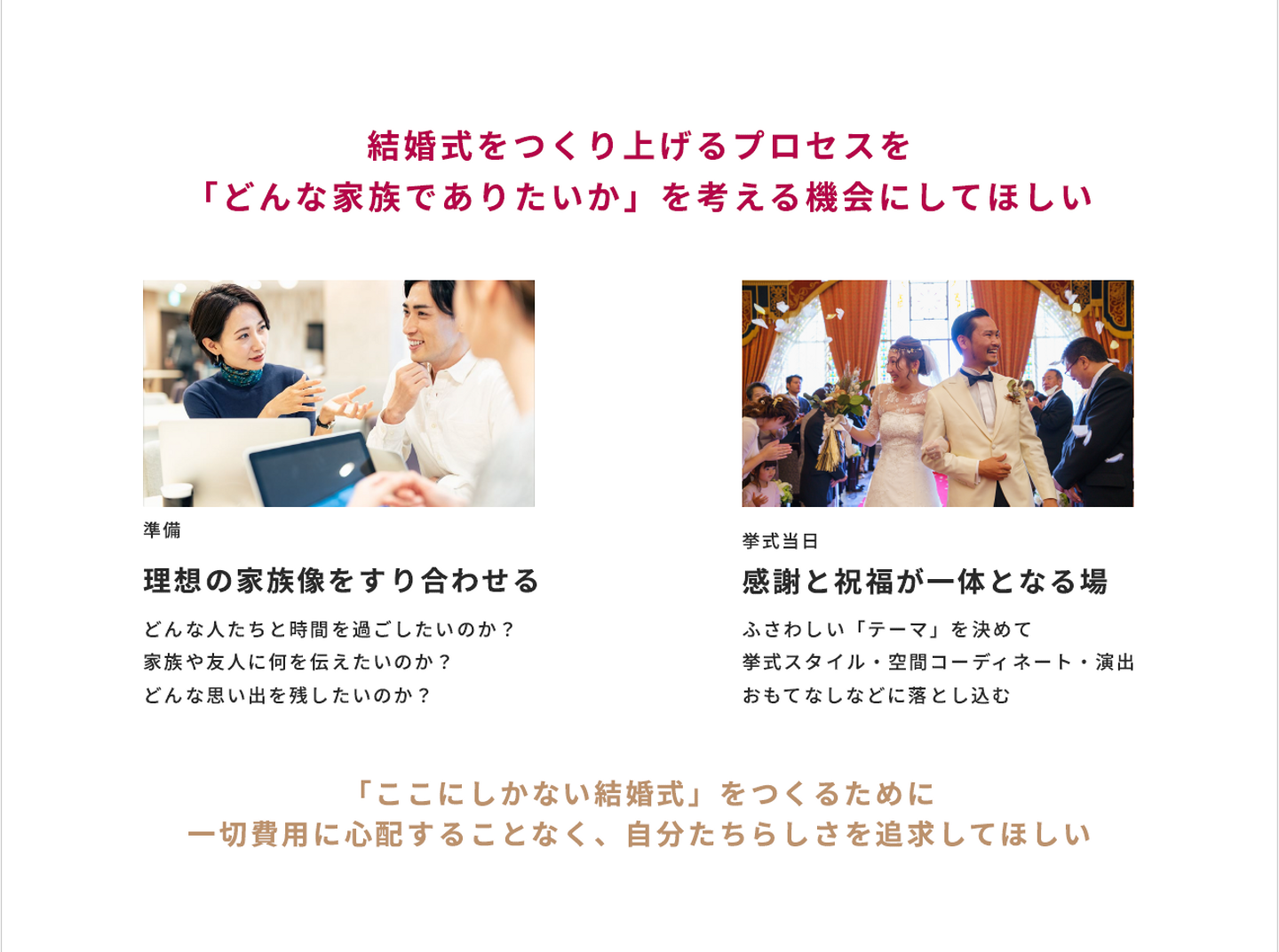 「当日をどんな場にしたいのか」「おふたりがどんな家族でありたいのか」を共に考えられるようなウエディングプランをつくりたい——。