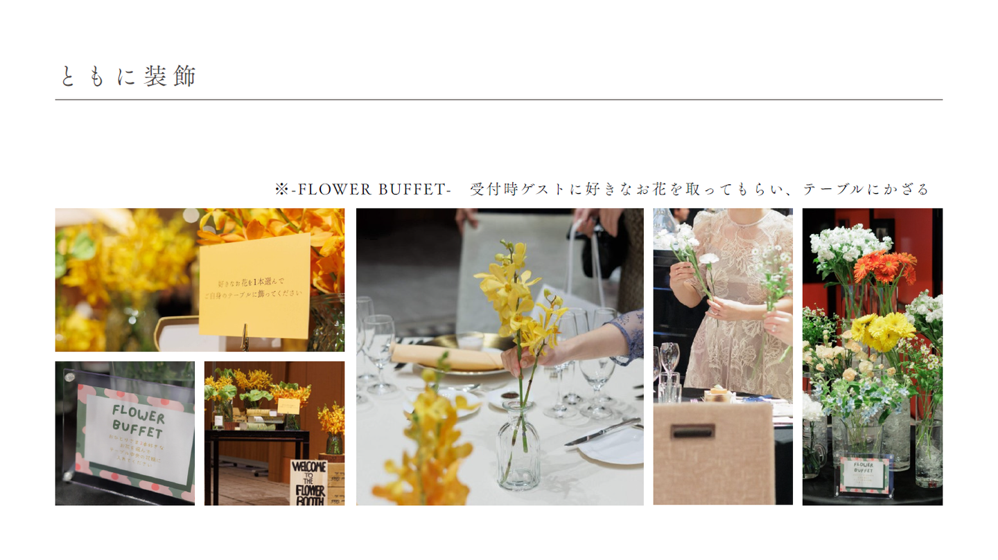 そこで「誓い」「つながり」「らしさ」「おもてなし」の4つの切り口で整理し、式場の魅力だけに頼ることなく「演出‧空間コーディネート・アイテム選定‧持ち込みアイデア」まで含めて提案することが、私たちの提案したいウエディングプランだとなりました。
