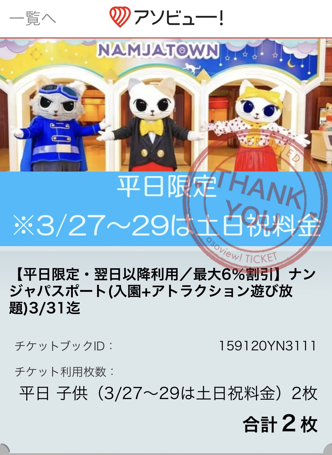 アソビュー経由で子どもたちのフリーパスを購入したので、正規で購入すると3200円のところ、アソビュー✖️Perk利用で1枚2910円になりました!