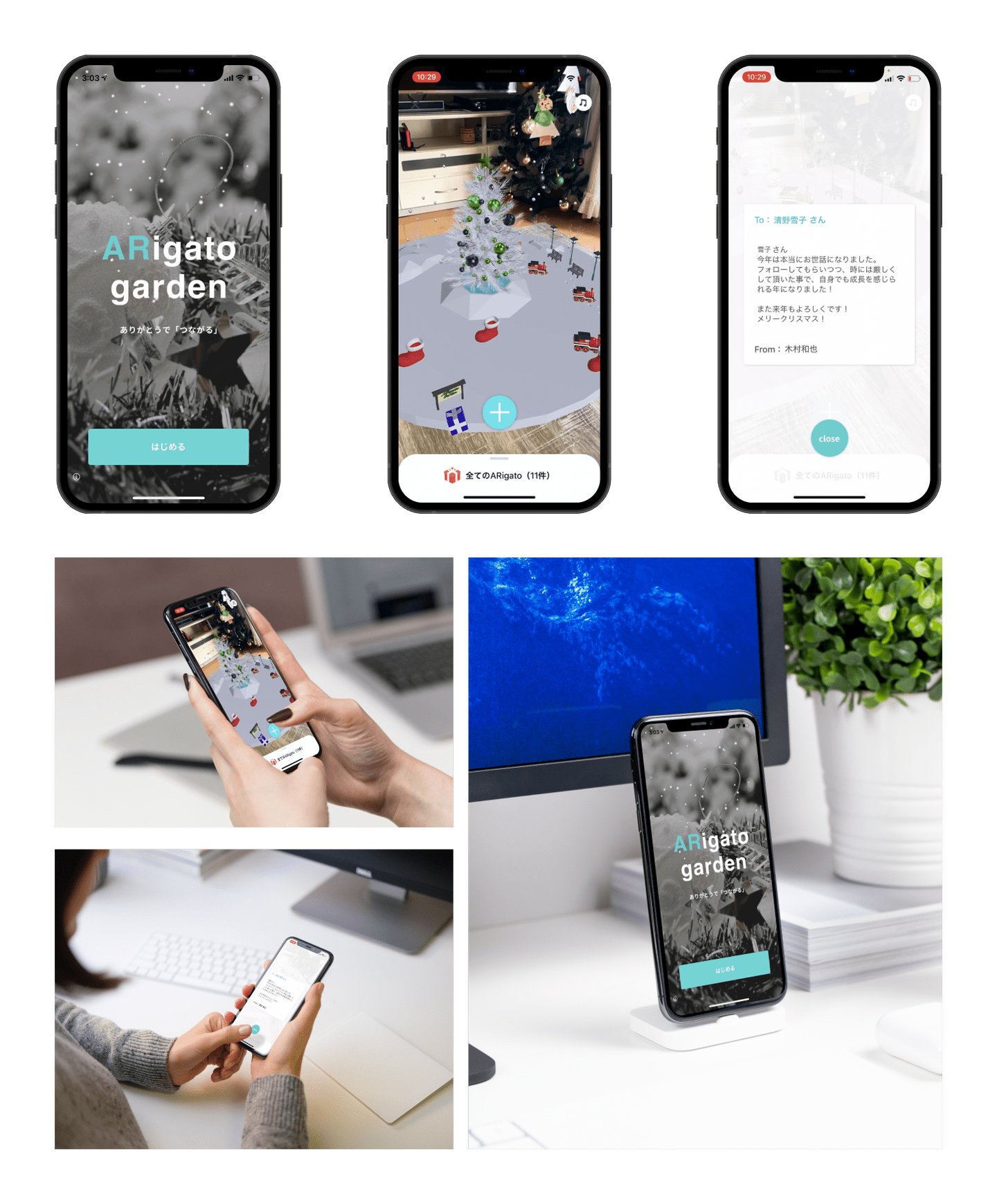 "ありがとう"を贈りたい人を指名してメッセージを送信すると、そのメッセージがクリスマスオブジェとなり、AR空間に飾られていくというアプリです!