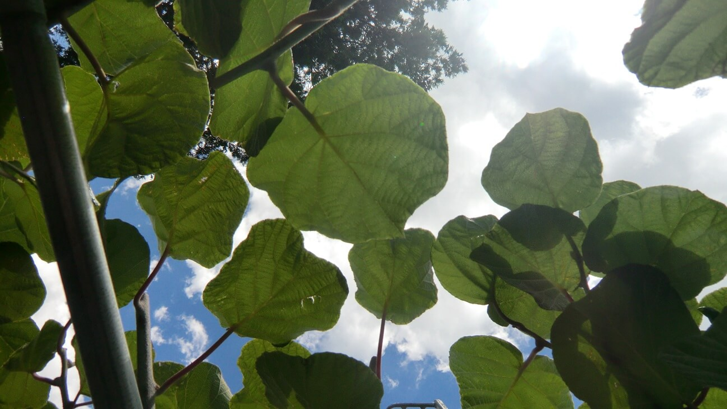 2018年5月のある日、ベジアーツの庭では青々と生い茂った大きな葉っぱが通り過ぎるスタッフ達の目を引いています。