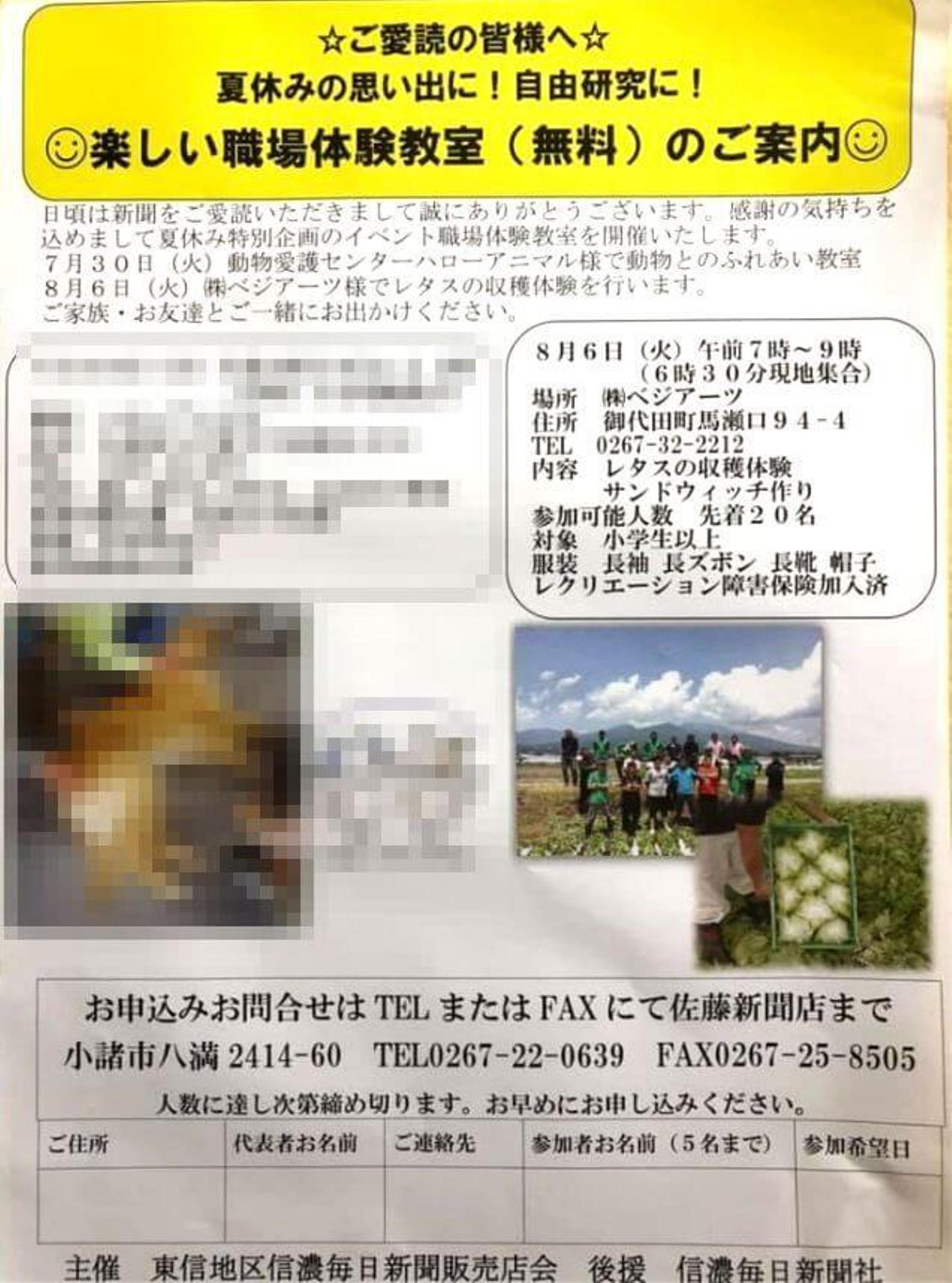 8月6日に、東信地区信濃毎日新聞販売店会様主催「職場体験教室」ということで、ベジアーツのレタス収穫体験を開催致しました!