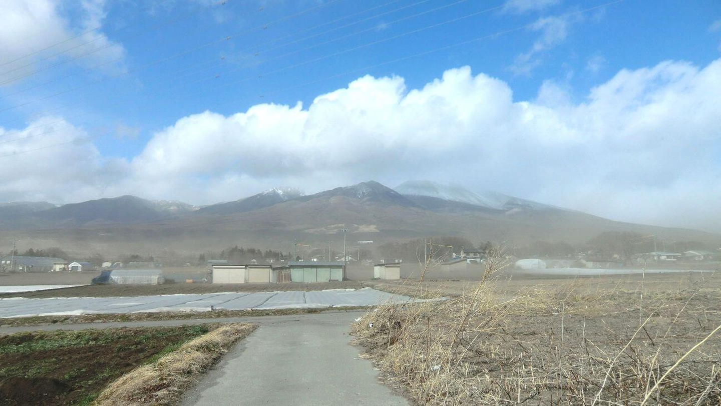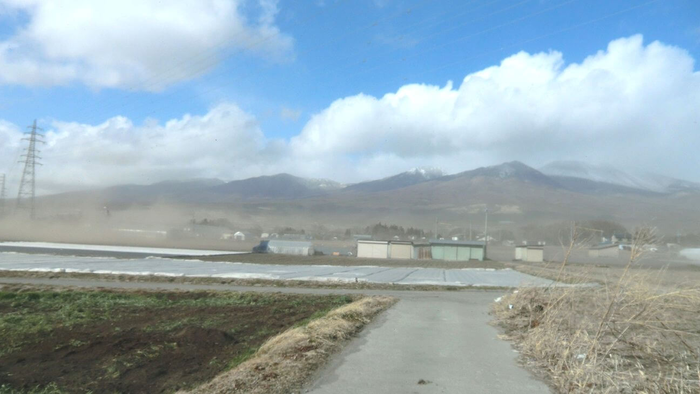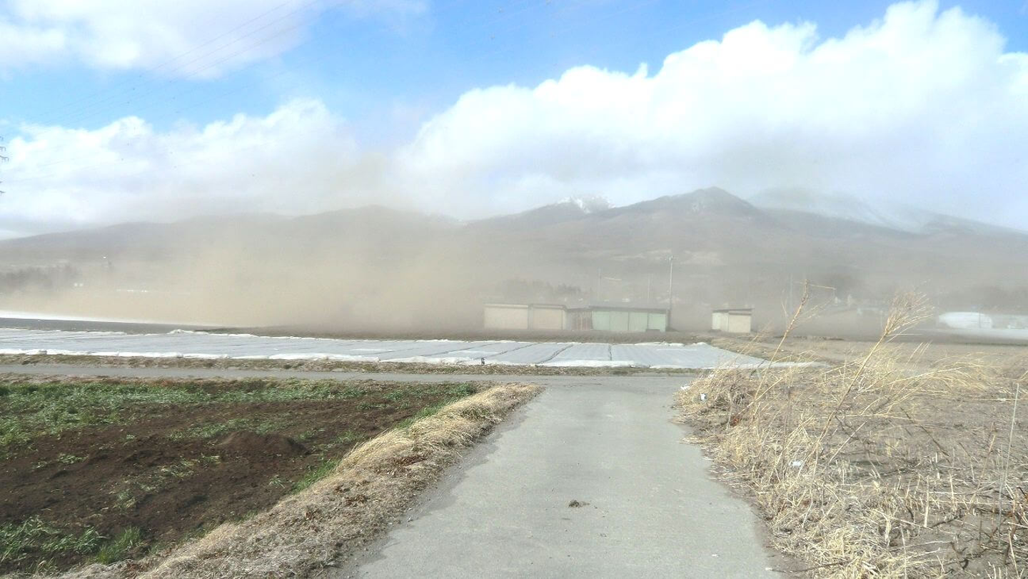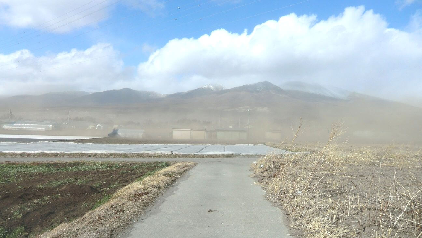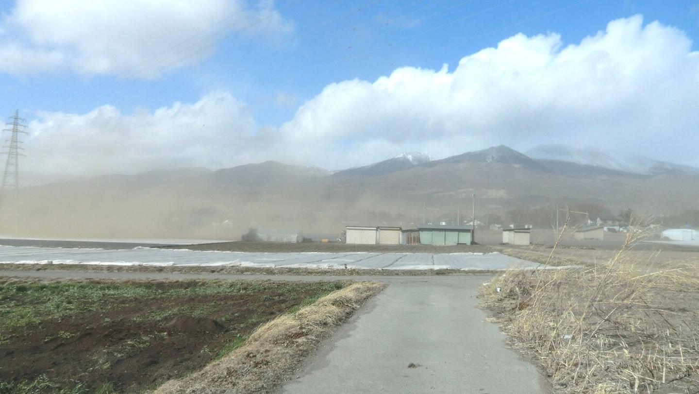 浅間山に向かって左側から、徐々に砂埃が押し寄せてくるのがお分かり頂けると思います。
