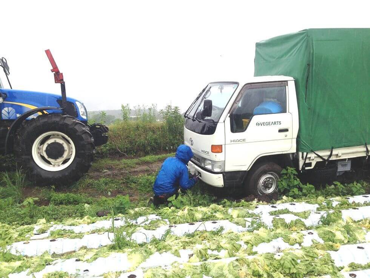 今年は長雨の影響により、あちらこちらで同じように身動きが取れなくなるトラクターやトラックが多いようです。