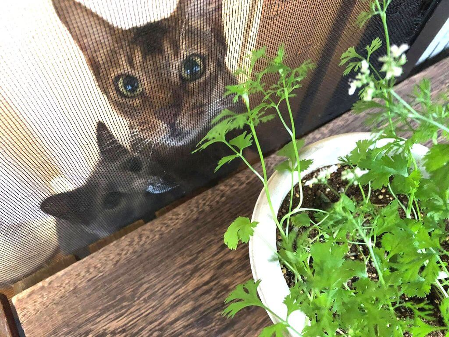 可愛いお花と、パクチーの香りに誘われた、ネコ達が、集まってきましたよ。