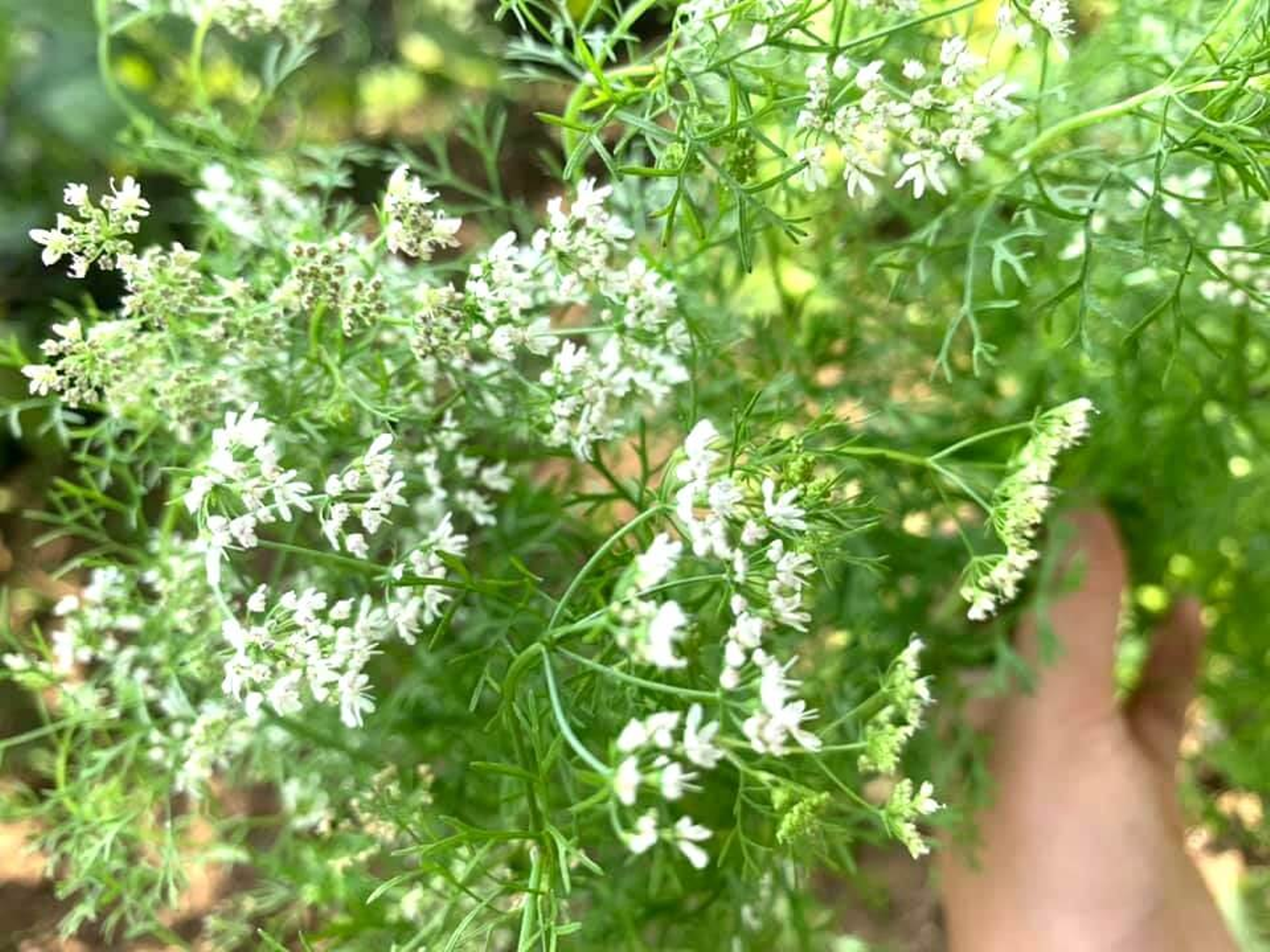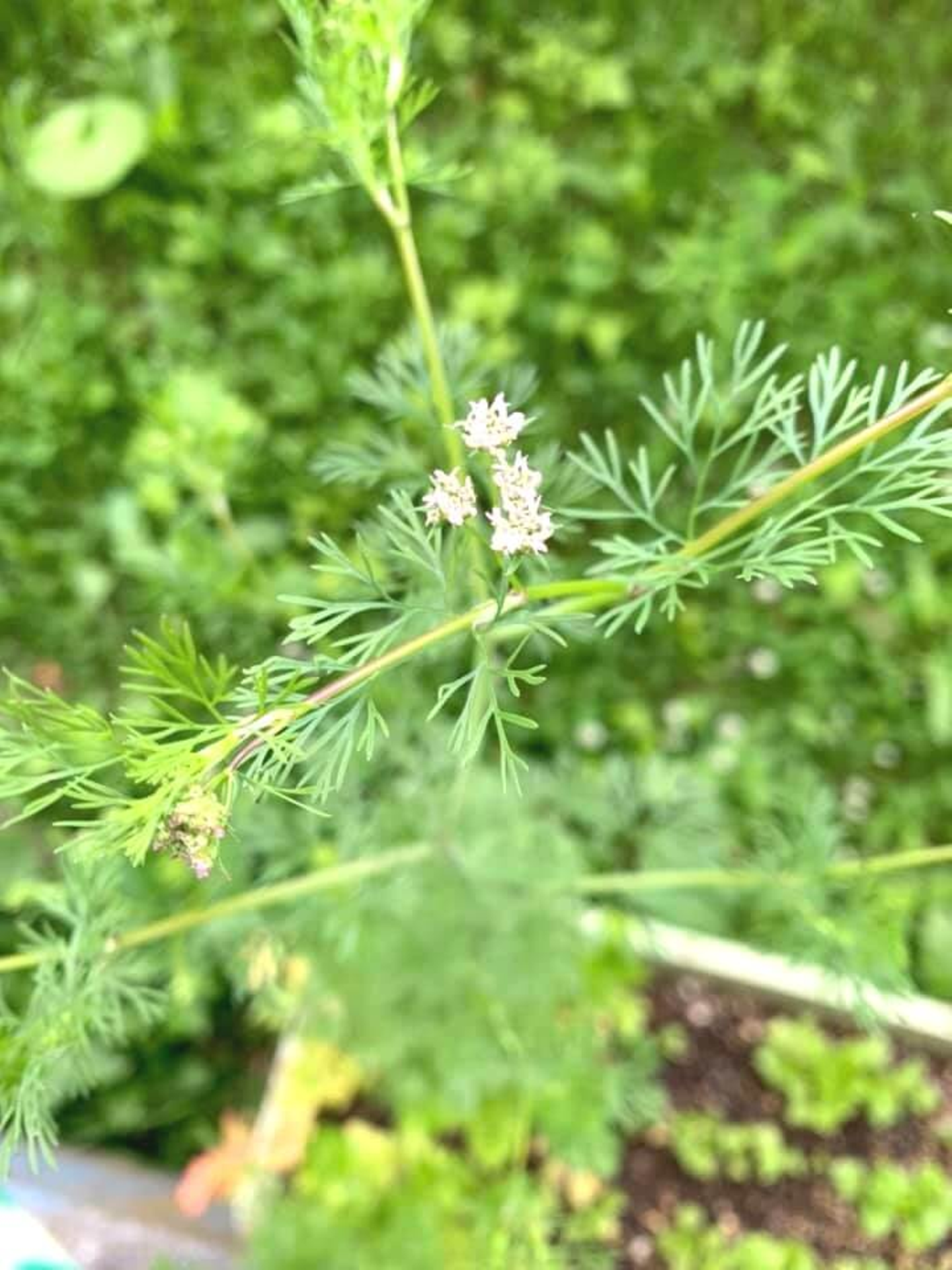 「うちのパクチーは葉の色が少し変わったりしていますが、小さなお花が咲いてきました。