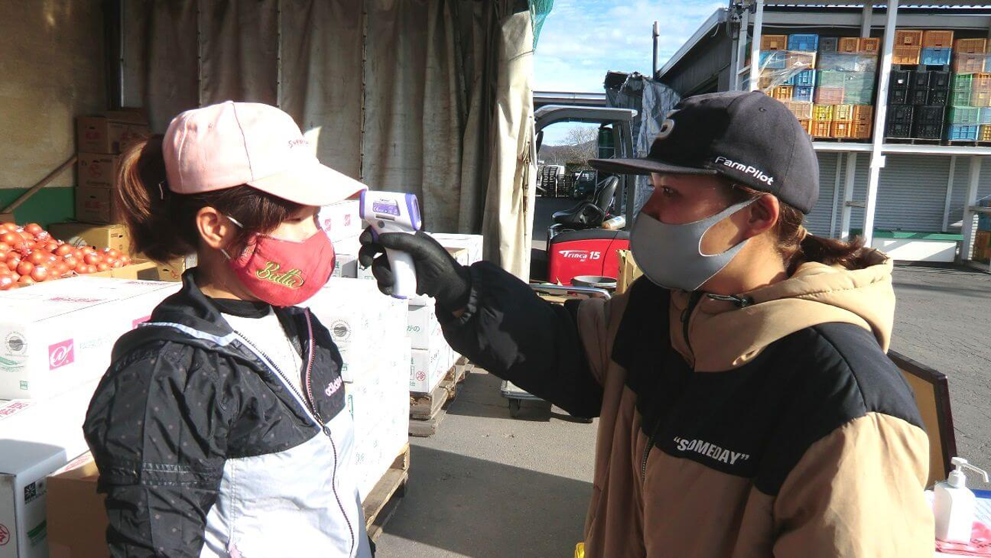まずは額に向かって機械をかざして、検温をさせて頂きます。