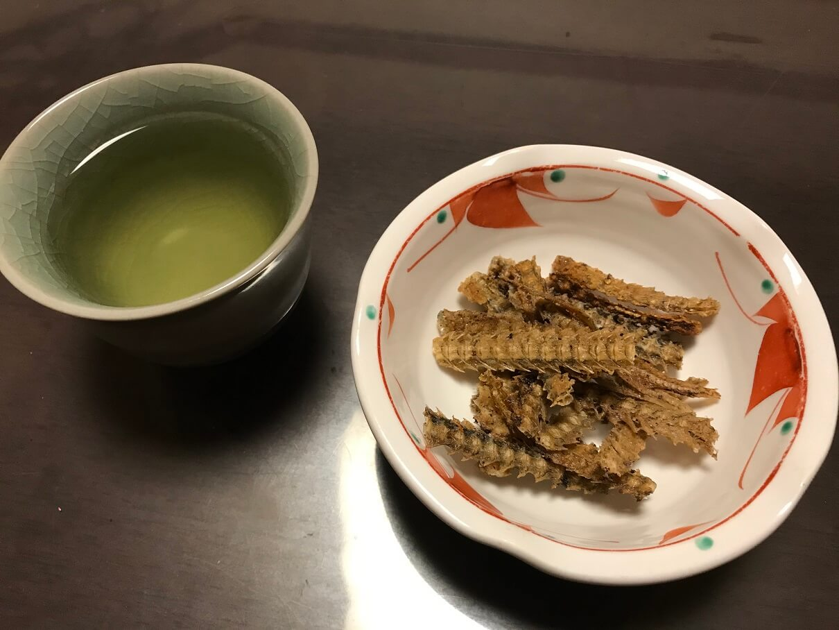 焼きあがるのを待っている間に、お茶と鰻の骨を楽しむことができます。