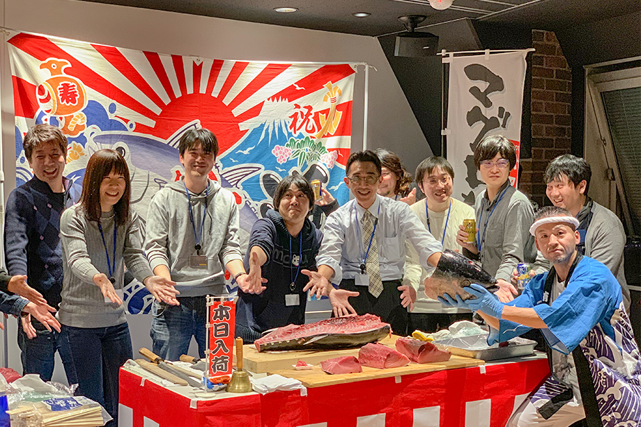 先日弊社では、ラウンジにて従業員を集め新年会(マグロの解体ショー)を行いました!!