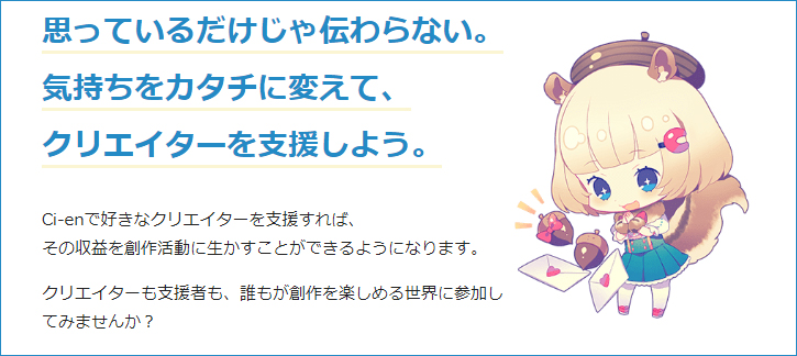 Ci-enはクリエイターに対して、金銭的な支援を送ることができる「クリエイター支援プラットフォーム」です。