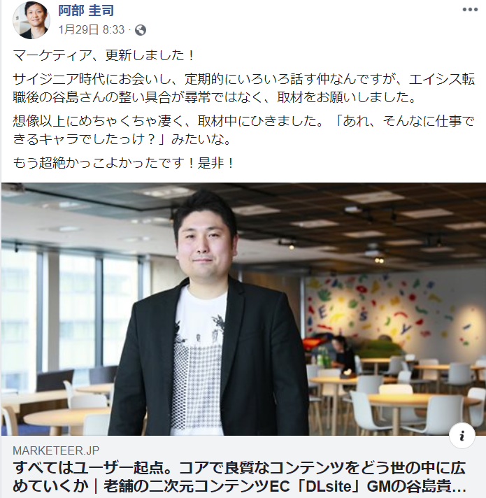 Facebookで阿部さんが私のことをこんな風に紹介されていました。