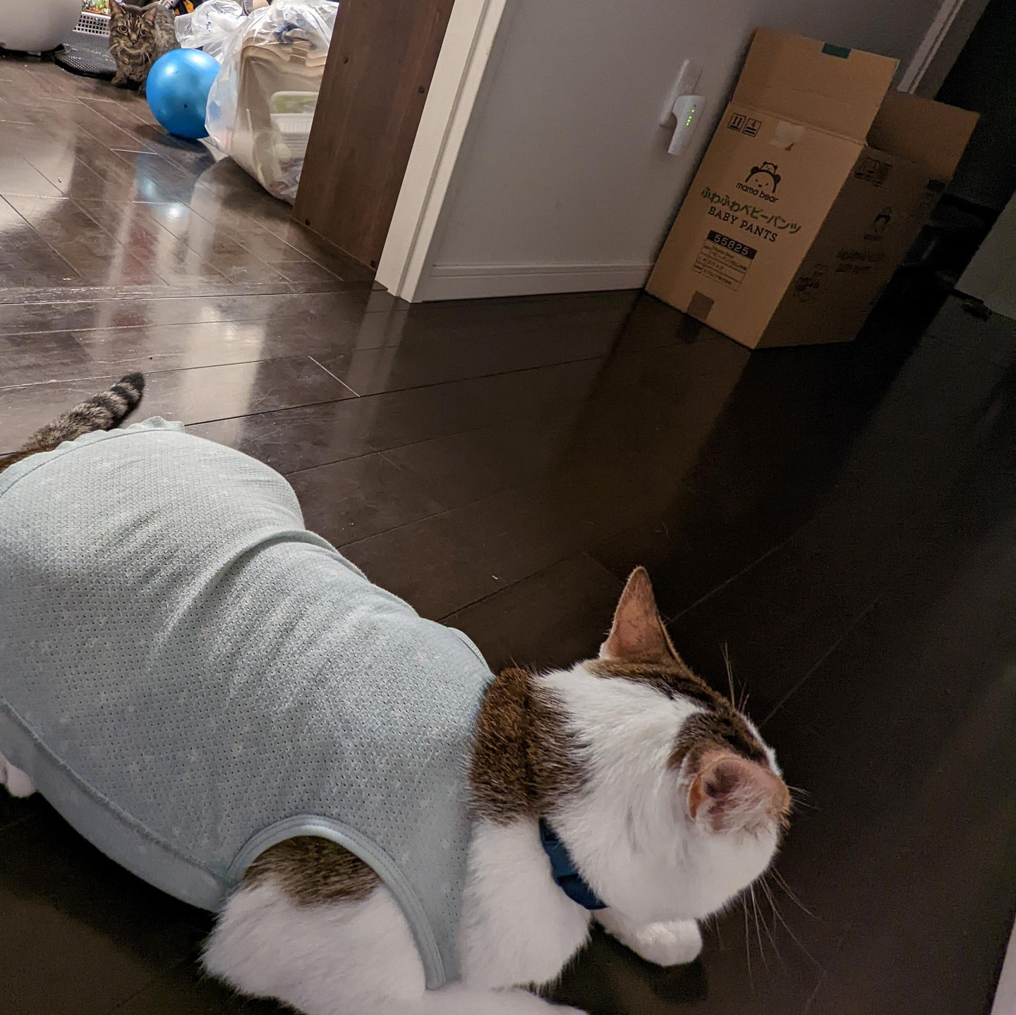 先日、息子の小さくなった肌着を兄ネコに着せたら、弟ネコが兄ネコを別ネコだと思いこんだらしく、完全に警戒して低い姿勢でじっと見つめていました。洋服1枚でそんな顔する!?っていう顔でした。