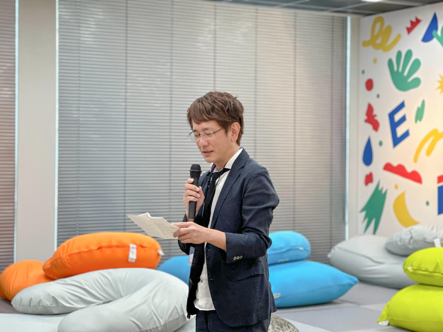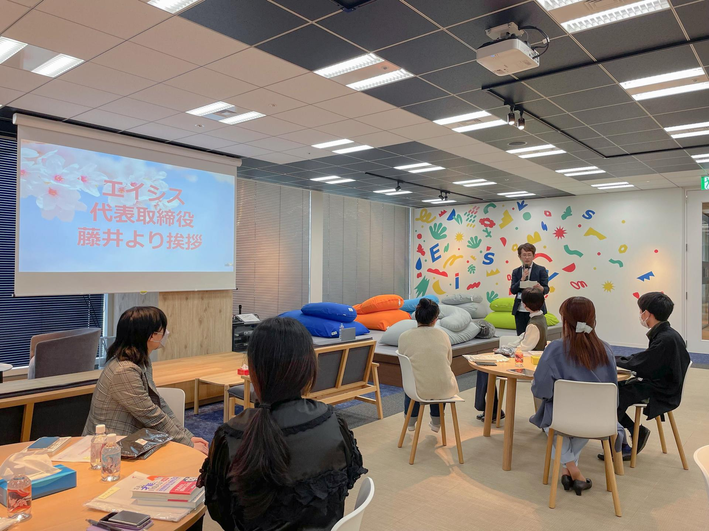 続いて、エイシス代表取締役の藤井からは、「上記に加え、仲間への思いやりと、リスペクトを持って仕事に取り組んでほしいこと。会社に所属する最大のメリットは、多くの仲間と喜びを共有できることであること。いろいろと大変なこともあるかも知れないけど、会社や仕事が嫌になったりする前に、困ったら抱え込まずに相談してほしい」ということをお伝えさせていただきました。