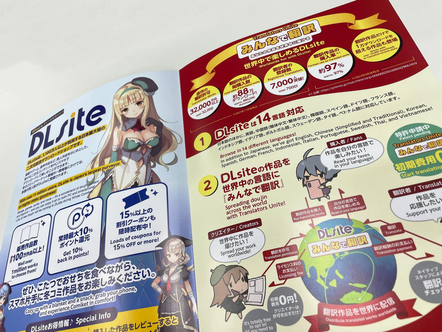 株式会社エイシスの展開する二次元コンテンツ総合ダウンロード販売サービス『DLsite』や世界中にマンガ・音声作品を届けたい原作者と有志の翻訳者をつなげるサービス『みんなで翻訳』について紹介したパンフレットの無料配布を実施!日本語に加え英語表記も併記したグローバル仕様のパンフレットを準備し、当日は様々な国籍の方にお手に取っていただくことができました!