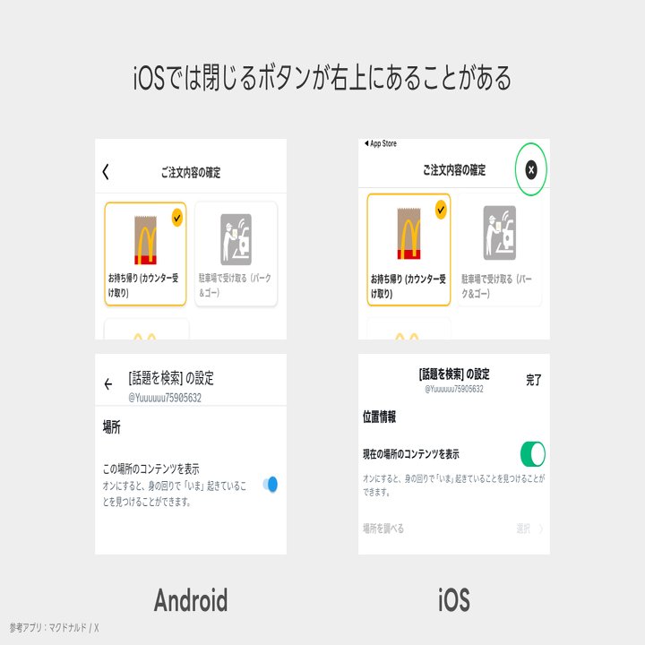 iOSアプリでは、特にモーダル画面やダイアログ、サイドメニューなどのヘッダーの右側に「閉じる」ボタンが配置されていることがよくあります。