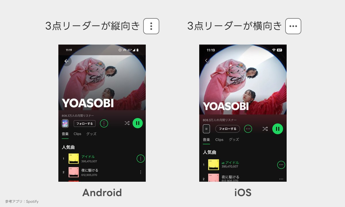 スマホアプリでよく見かける「その他のメニュー」を示す三点リーダー(…)のアイコンですが、AndroidとiOSで向きが異なることにお気づきでしょうか?
