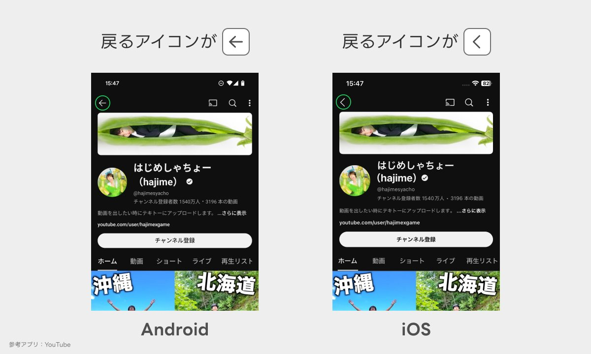 AndroidとiOSでは、「前の画面に戻る」ためのアイコンに大きな差があります。AndroidではMaterial Designのガイドラインに沿った真っすぐな左向き矢印が標準的で、画面上部のアクションバー(トップアップバー)に配置されることが多いようです。