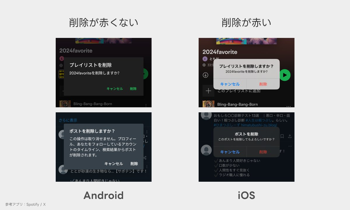 一方、Androidアプリでは、破壊的アクションに赤色を使用しないケースが多くあります。