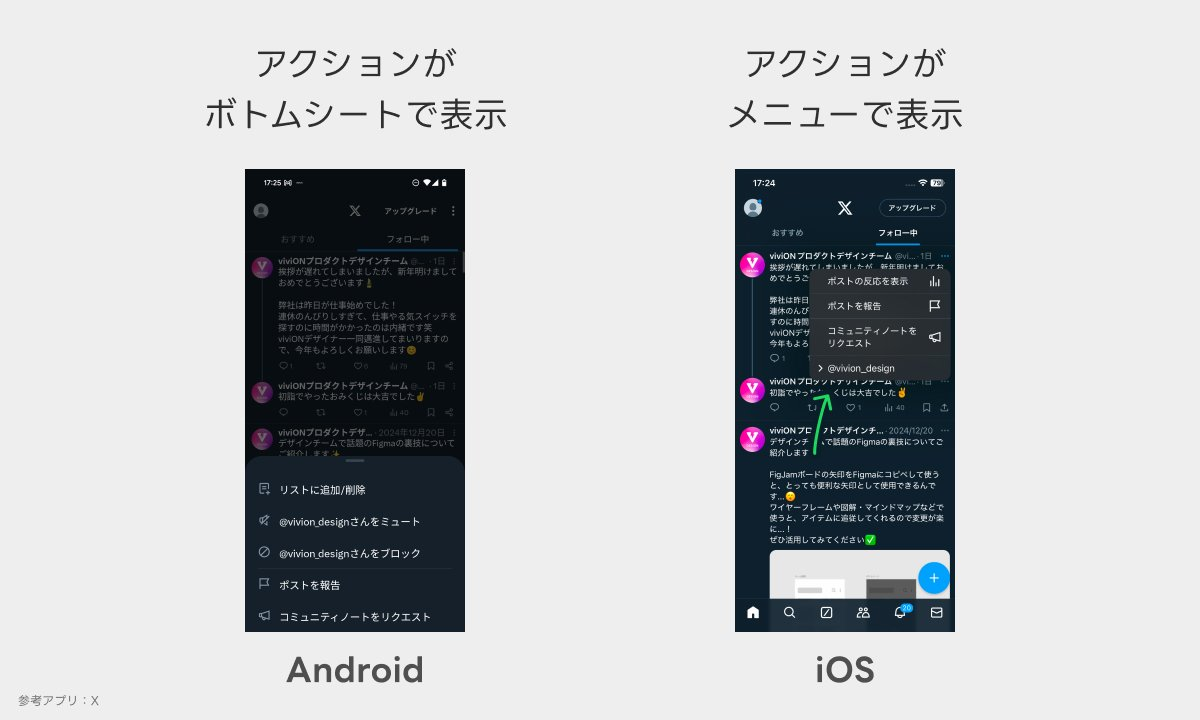 一方、iOSでよく使われる「アクションシート」は、オブジェクトの近くにスッと表示され、選択肢をタップすることで操作や設定が行えます。シンプルで直感的ですが、選択肢が多くなると、画面が狭く感じられることがあります。また、さまざまなスマホの画面サイズに対応するのが難しいという点もあります。